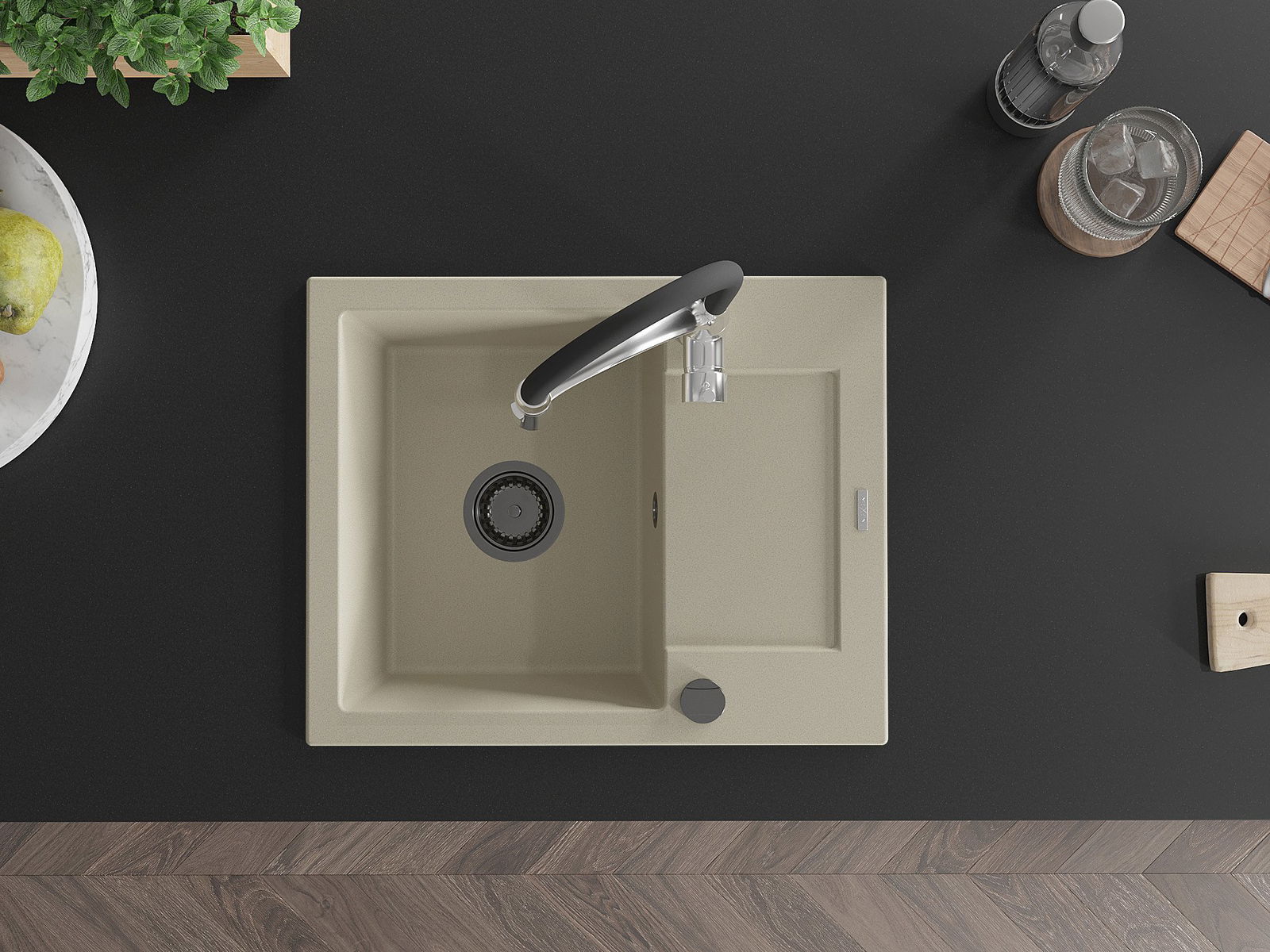 Die Spüle besteht aus hochwertigem Granit. Es ist eine elegante und vor allem praktische Ergänzung zu jeder Küche, unabhängig von ihrem Stil. Hohe Qualität und Granitdauer sorgen für eine langjährige Nutzung.