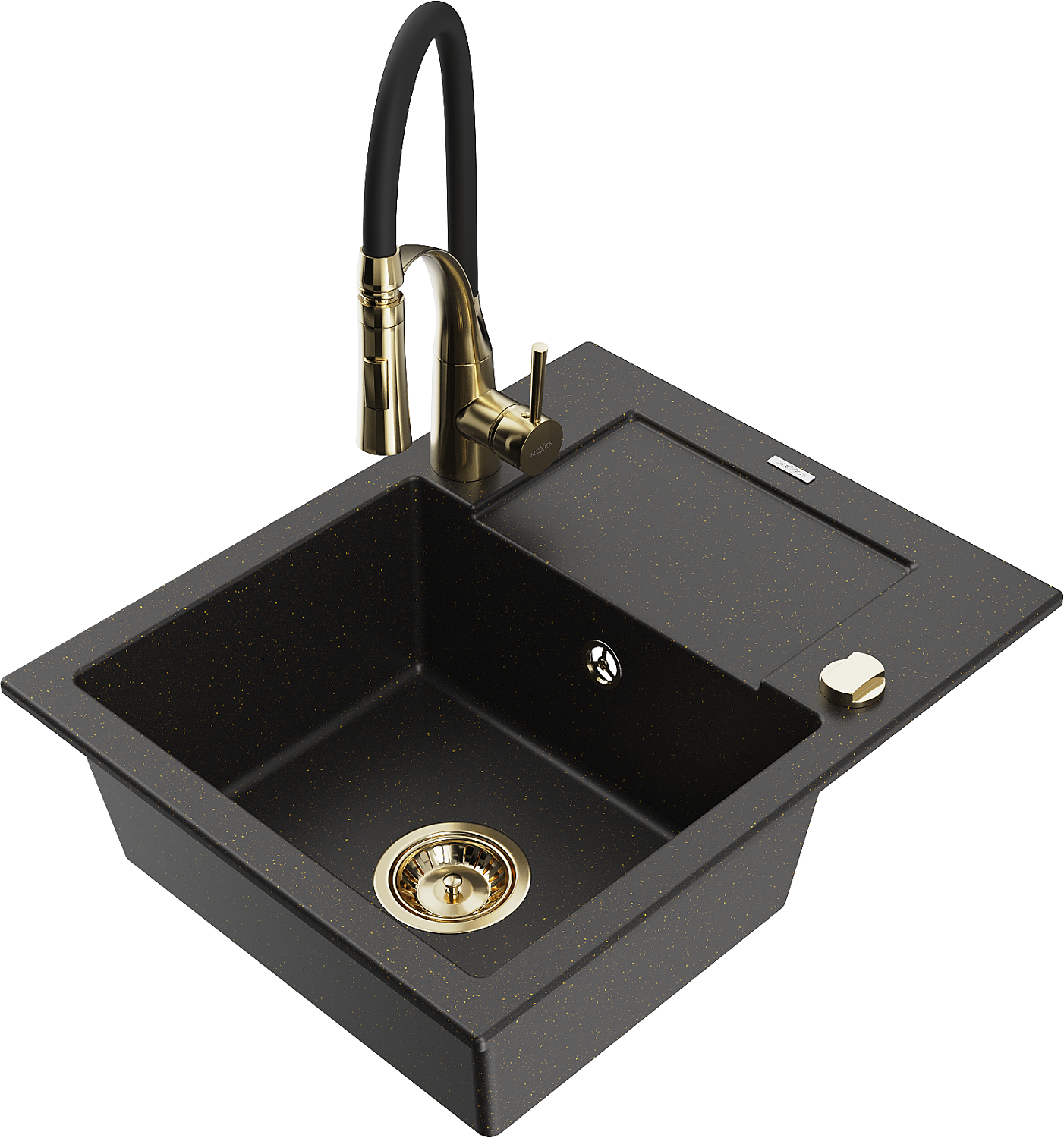 Mexen Enzo Granitspüle mit 1 Becken und Abtropffläche sowie Küchenarmatur Aster, Schwarz/Gold Metallic - 6506-75-73450-57-G