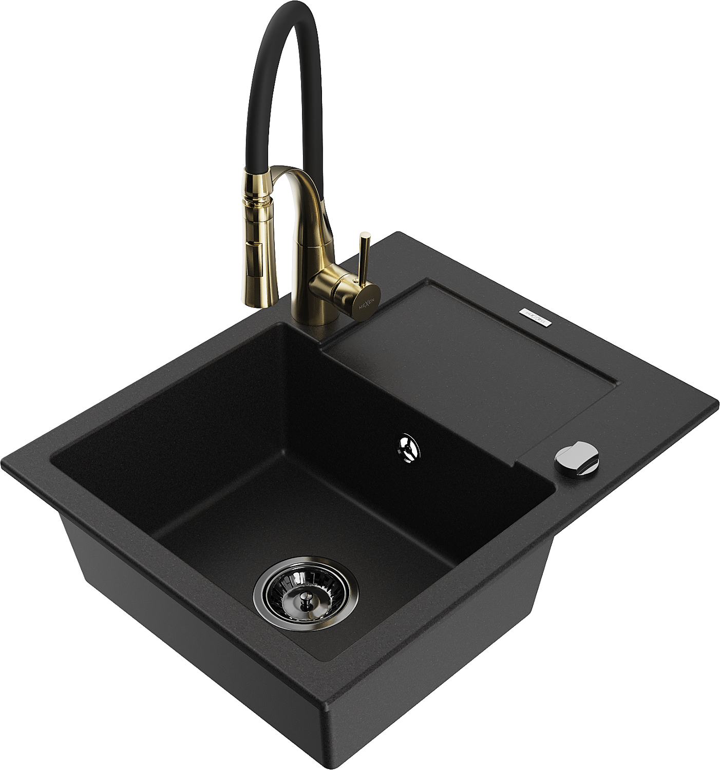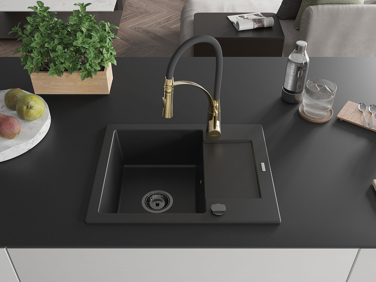 Mexen Enzo Granitspüle 1-Becken mit Abtropffläche und Küchenarmatur Aster, schwarz - 6506-77-73450-57-B