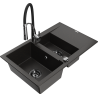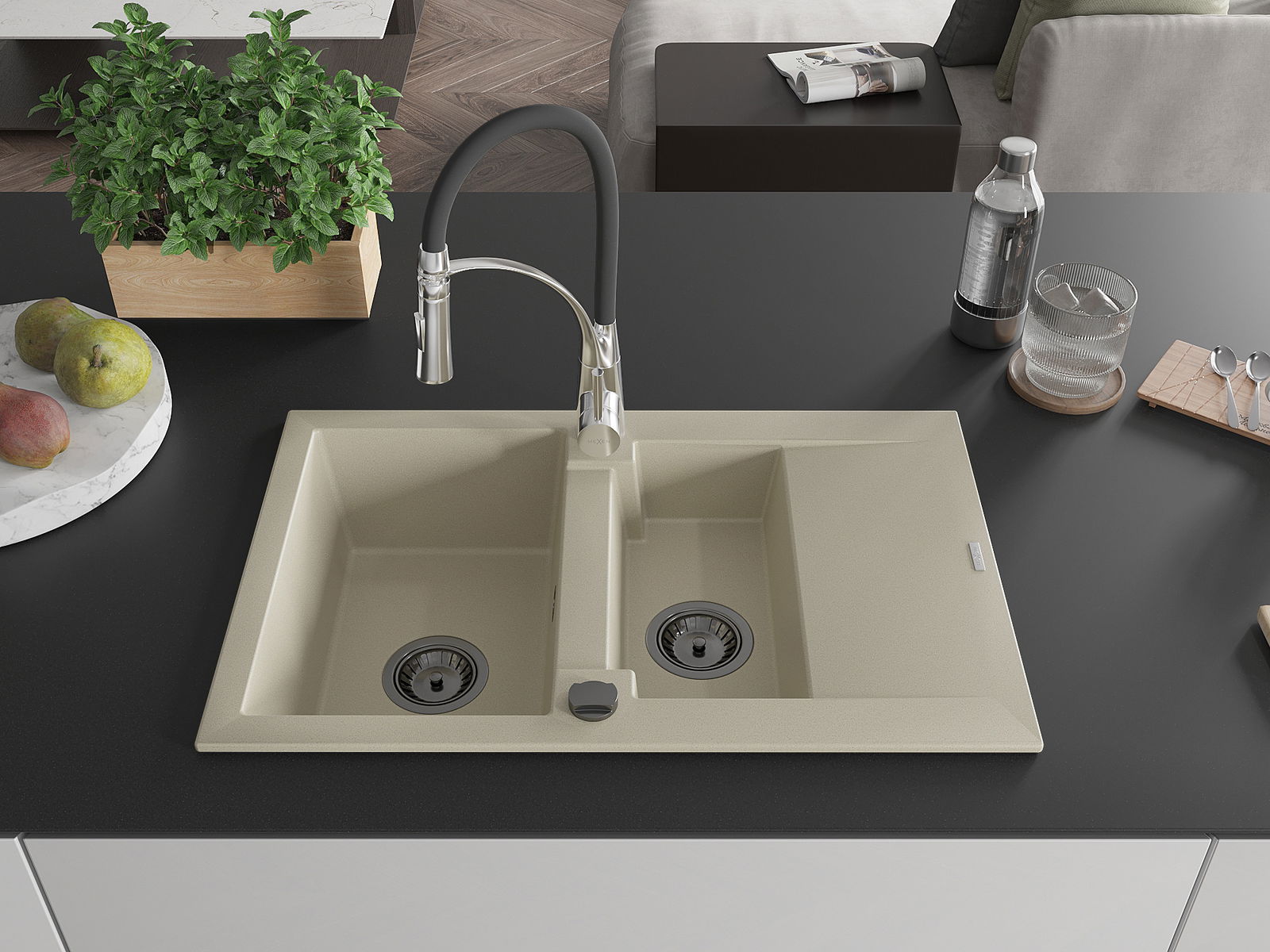 Die Spüle besteht aus hochwertigem Granit. Es ist eine elegante und vor allem praktische Ergänzung zu jeder Küche, unabhängig von ihrem Stil. Hohe Qualität und Granitdauer sorgen für eine langjährige Nutzung.