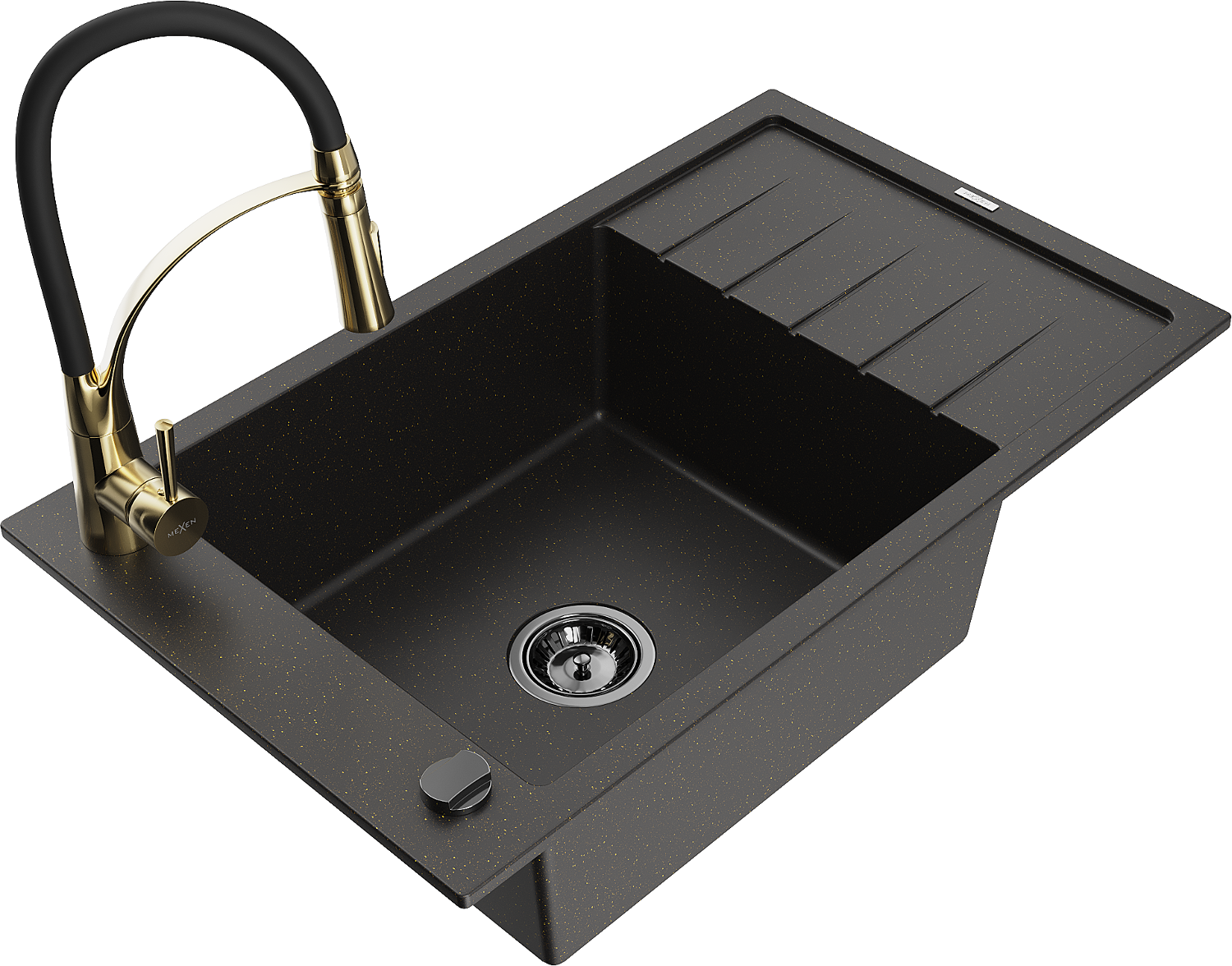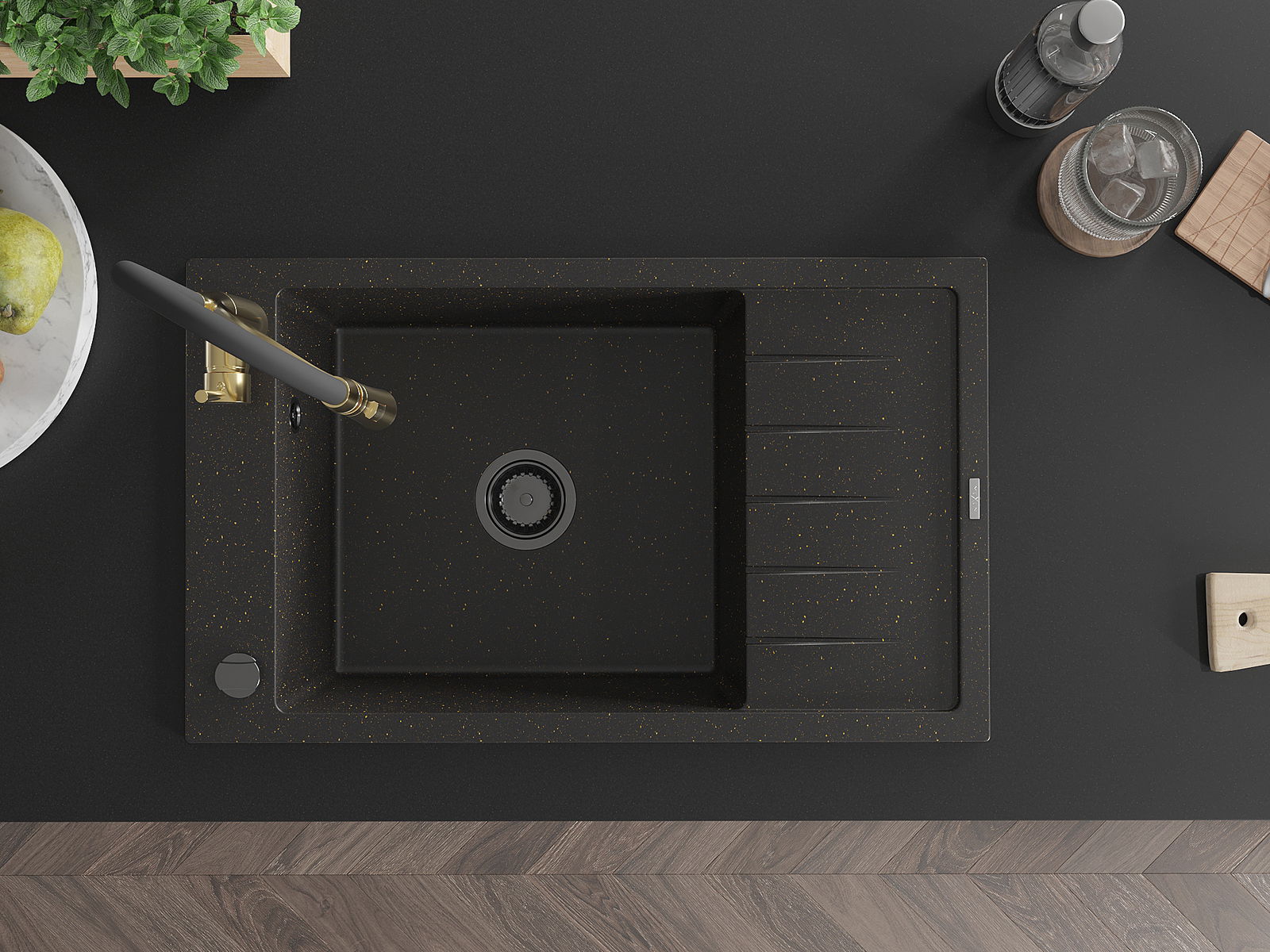 Mexen Elias Granitspüle 1-becken mit Abtropffläche und Küchenarmatur Aster, schwarz/gold metallic - 6511-75-73450-57-B