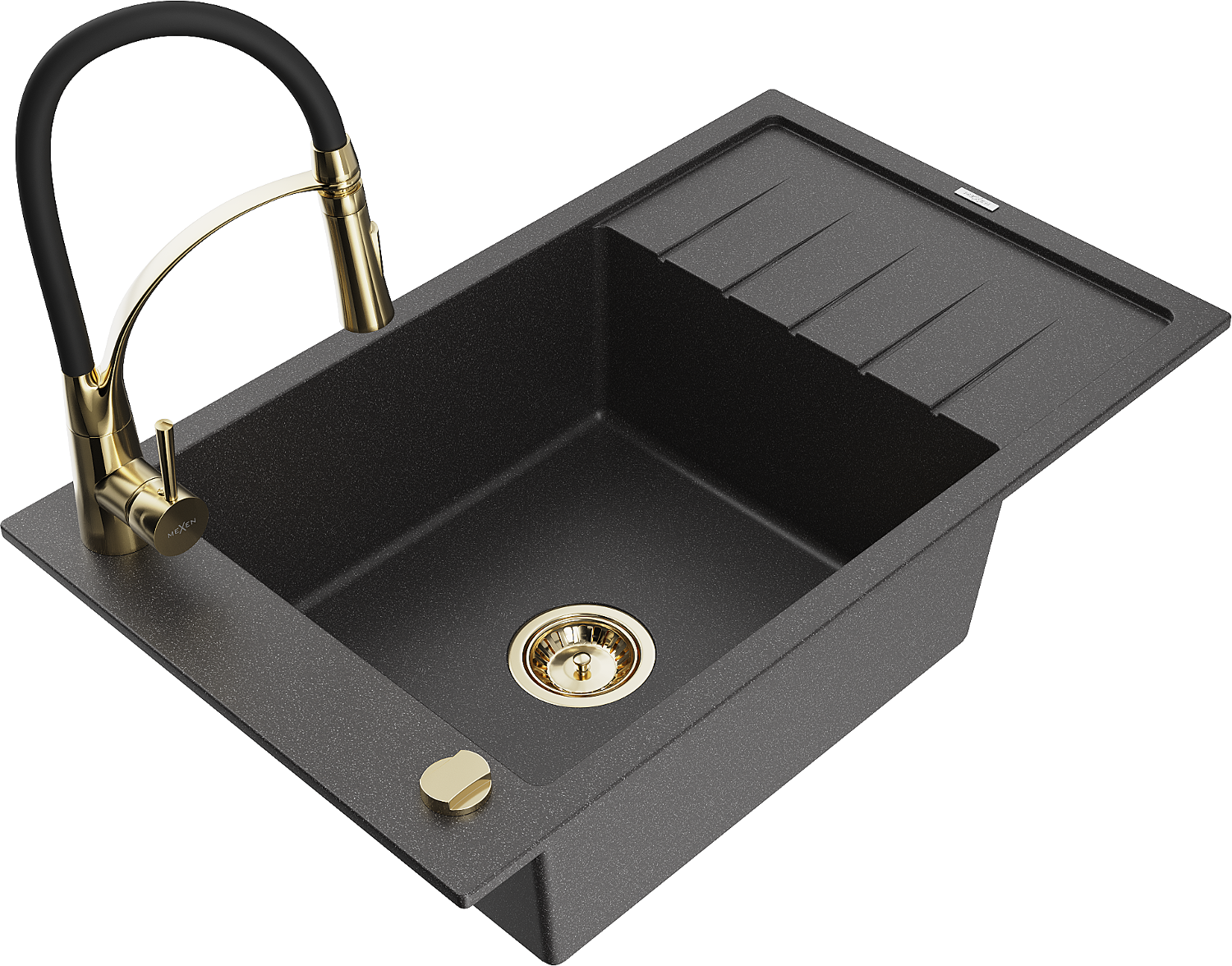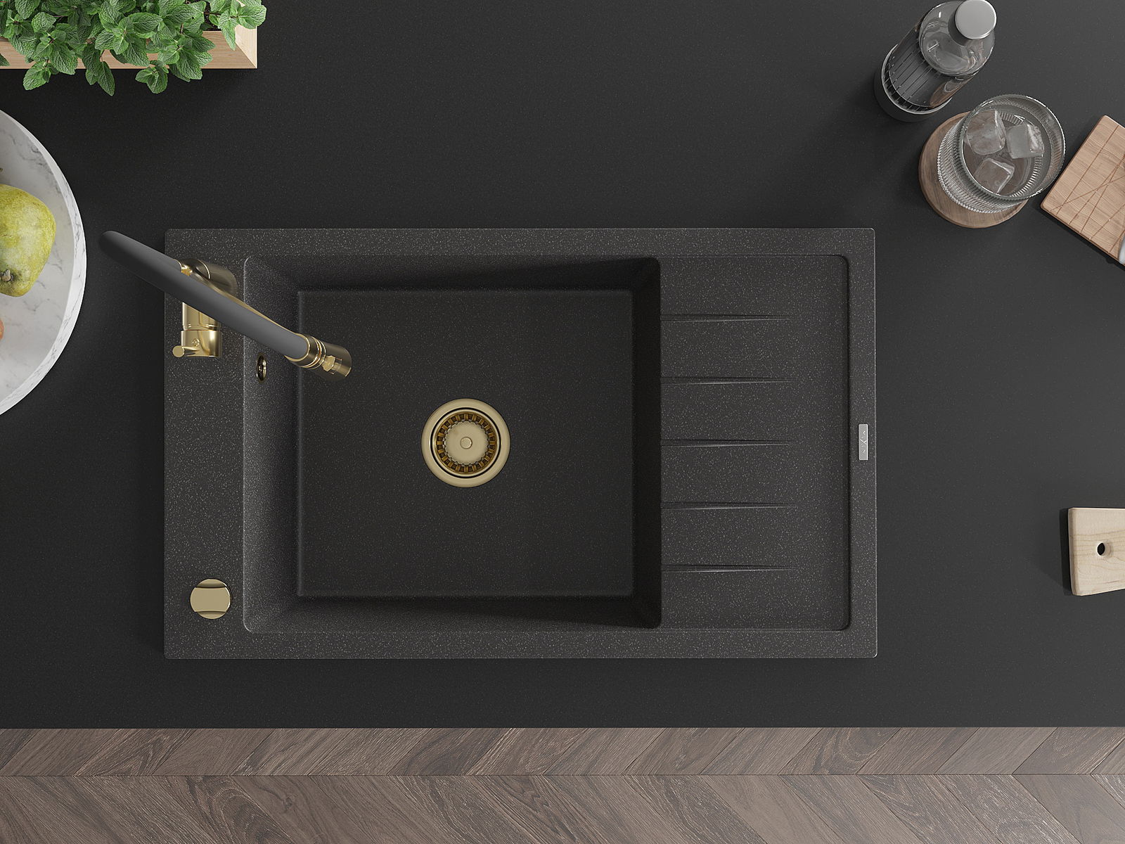 Mexen Elias Granitspüle 1-Becken mit Abtropffläche und Küchenarmatur Aster, schwarz gesprenkelt - 6511-76-73450-57-G