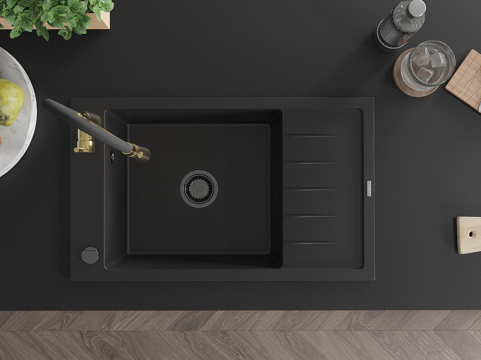 Die Spüle besteht aus hochwertigem Granit. Es ist eine elegante und vor allem praktische Ergänzung zu jeder Küche, unabhängig von ihrem Stil. Hohe Qualität und Granitdauer sorgen für eine langjährige Nutzung.