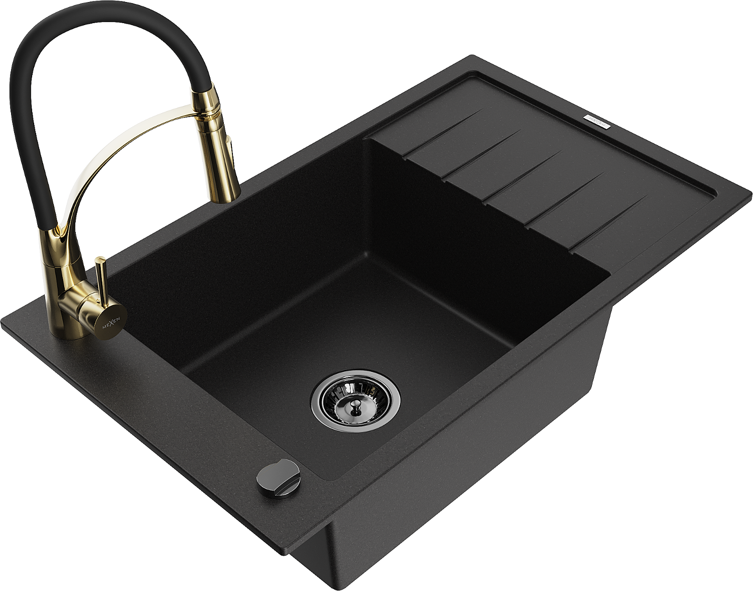 Mexen Elias Granitspüle 1-beckig mit Abtropffläche und Küchenarmatur Aster, schwarz - 6511-77-73450-57-B