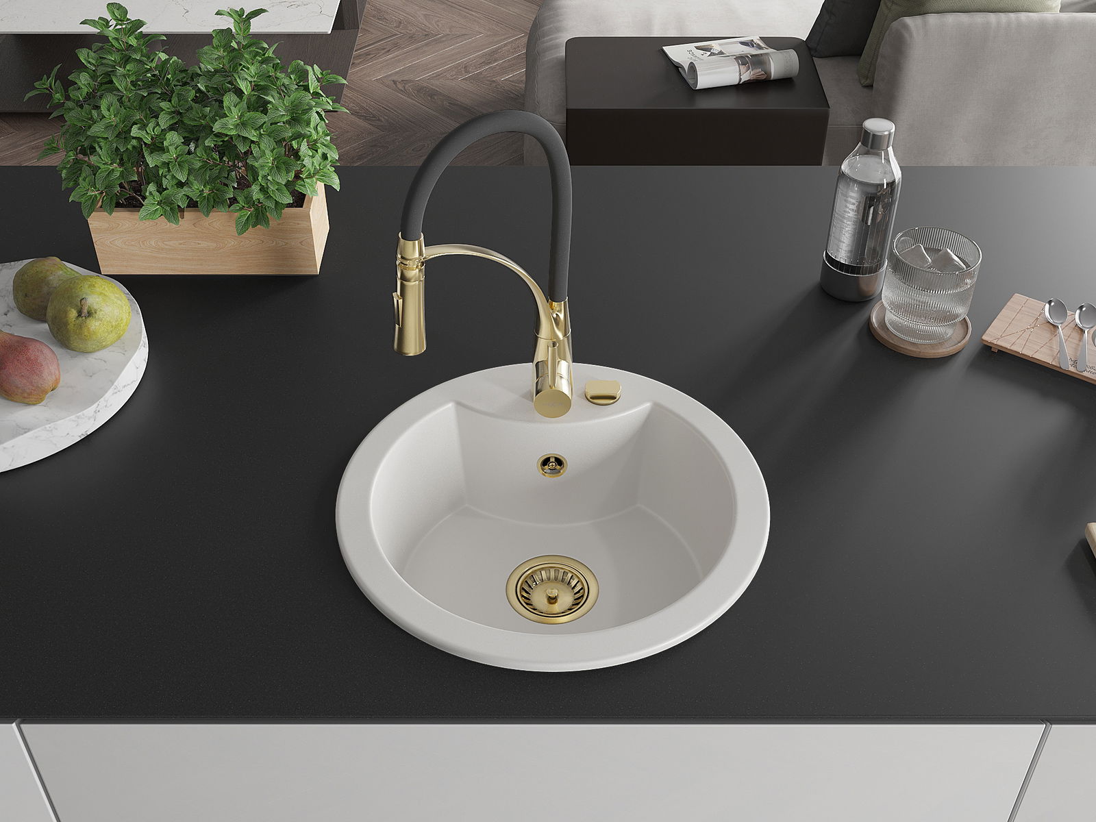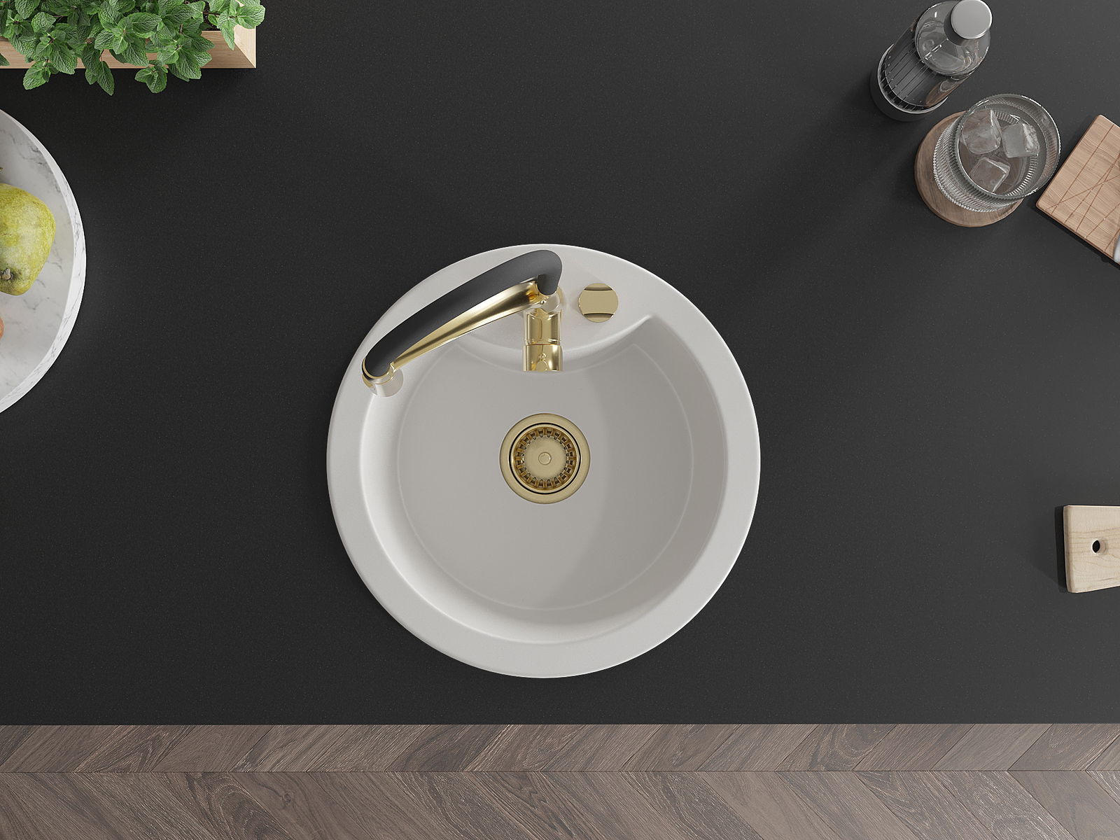 Die Spüle besteht aus hochwertigem Granit. Es ist eine elegante und vor allem praktische Ergänzung zu jeder Küche, unabhängig von ihrem Stil. Hohe Qualität und Granitdauer sorgen für eine langjährige Nutzung.