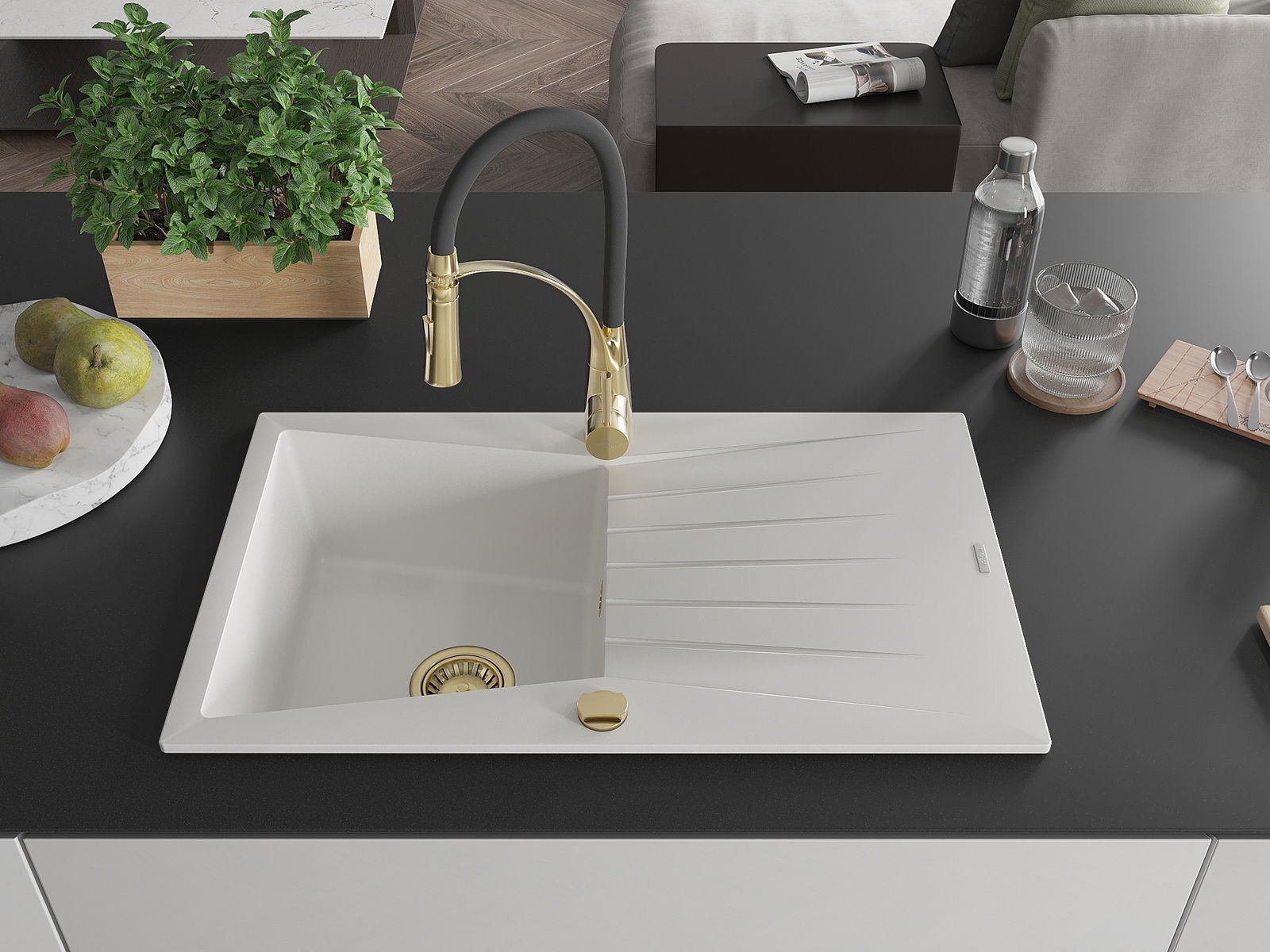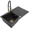 Die Spüle besteht aus hochwertigem Granit. Es ist eine elegante und vor allem praktische Ergänzung zu jeder Küche, unabhängig von ihrem Stil. Hohe Qualität und Granitdauer sorgen für eine langjährige Nutzung.