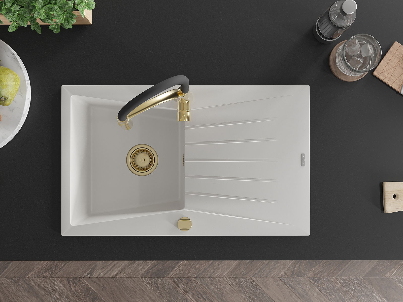 Dank des universellen Montagesystems ist die Spüle reversibel und der Abfluss kann links oder rechts auf der Theke montiert werden. Auf diese Weise können Sie die Seite einfach an Ihre Bedürfnisse und Bedingungen einstellen.