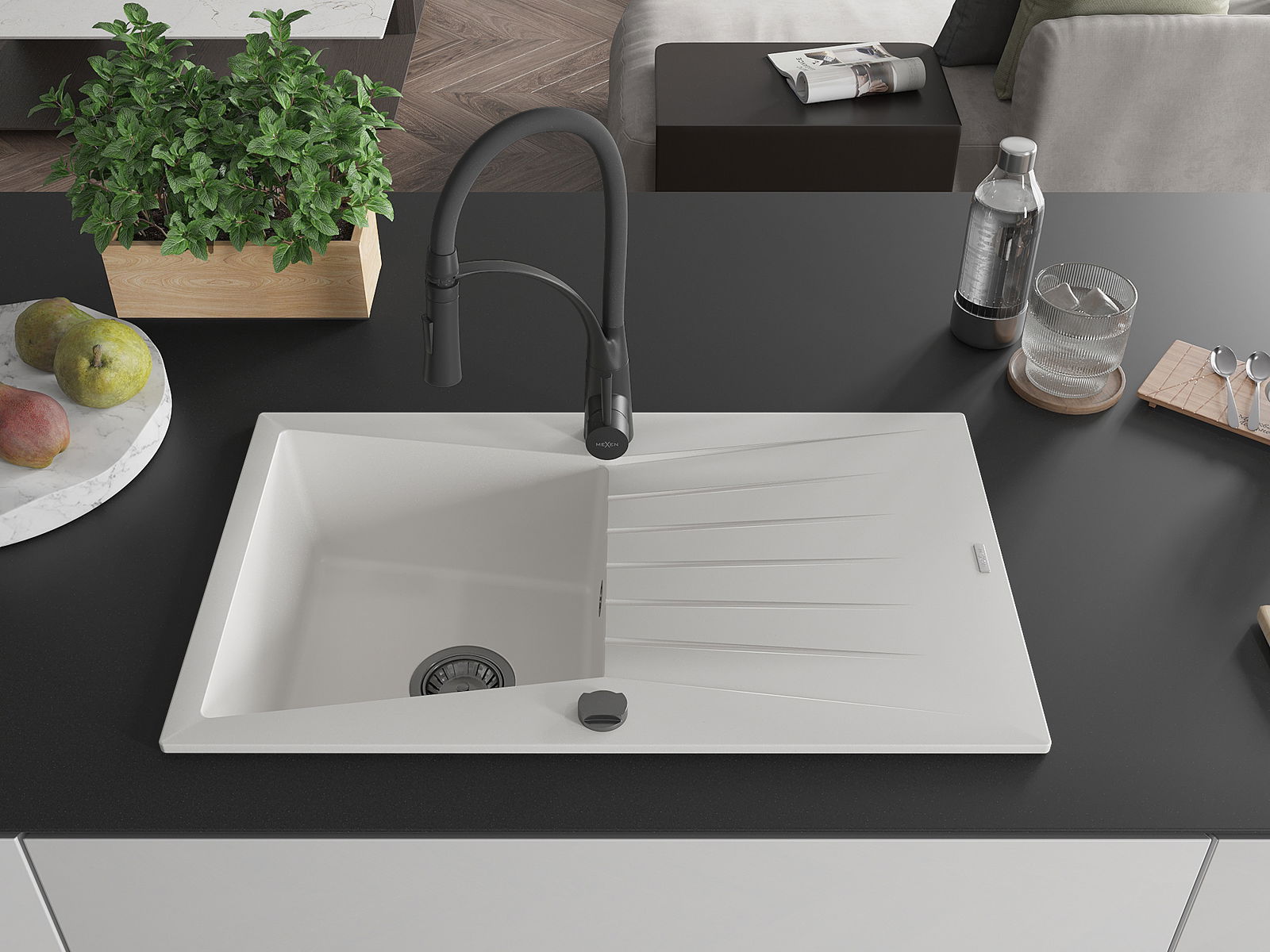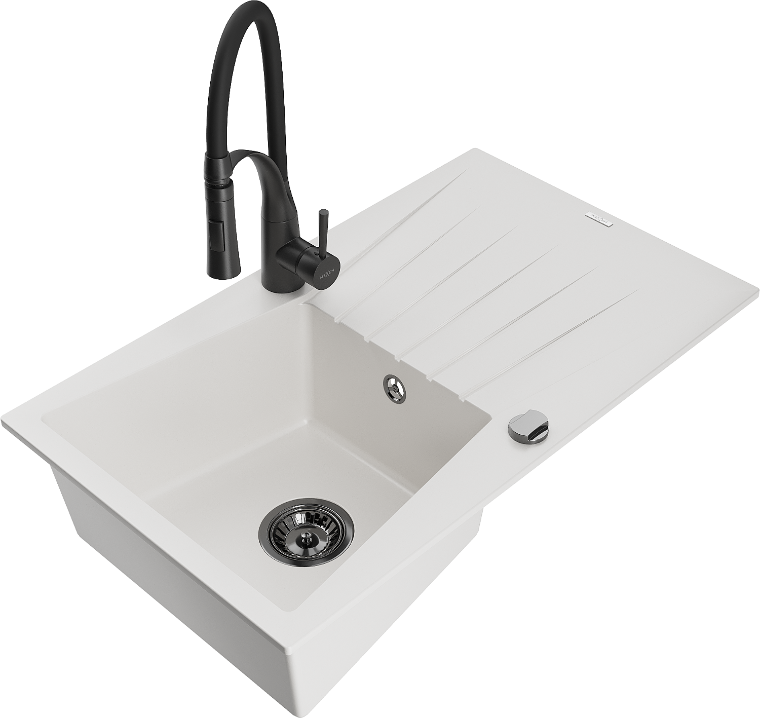 Mexen Cesar Granitspüle 1-beckig mit Abtropffläche und Küchenarmatur Aster, weiß - 6514-20-73450-70-B