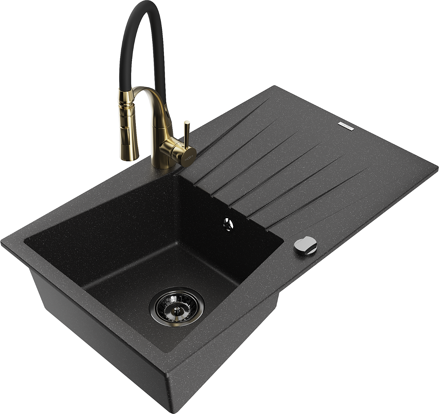 Mexen Cesar 1-Becken Granitspüle mit Abtropffläche und Küchenarmatur Aster, schwarz/silber-metallisch - 6514-73-73450-57-B
