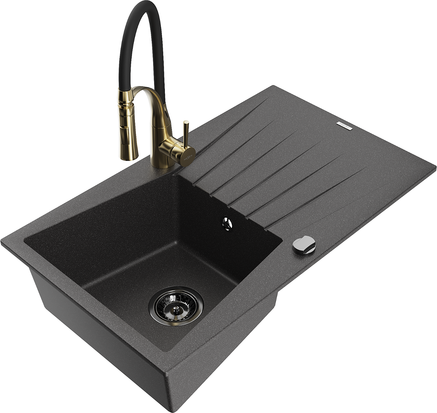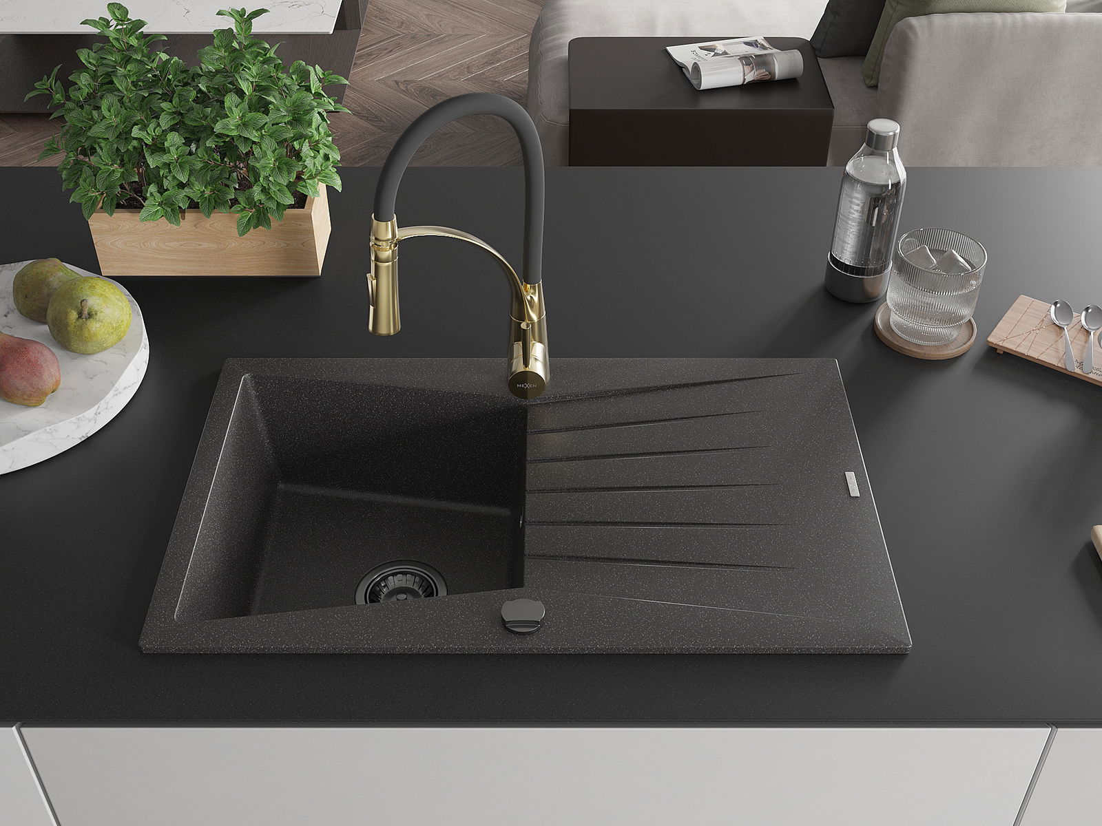 Mexen Cesar Granitspüle 1-beckig mit Abtropffläche und Küchenarmatur Aster, schwarz gesprenkelt - 6514-76-73450-57-B