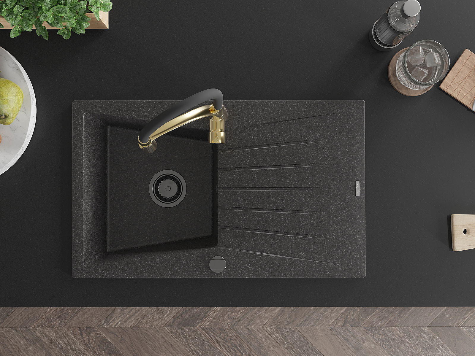 Die Spüle besteht aus hochwertigem Granit. Es ist eine elegante und vor allem praktische Ergänzung zu jeder Küche, unabhängig von ihrem Stil. Hohe Qualität und Granitdauer sorgen für eine langjährige Nutzung.