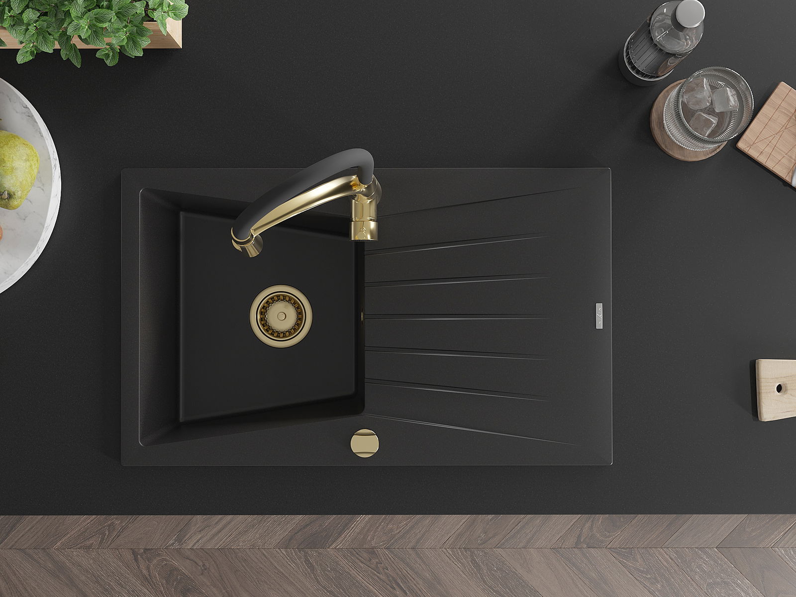 Mexen Cesar Granitspüle 1-Becken mit Abtropffläche und Küchenarmatur Aster, schwarz - 6514-77-73450-57-G