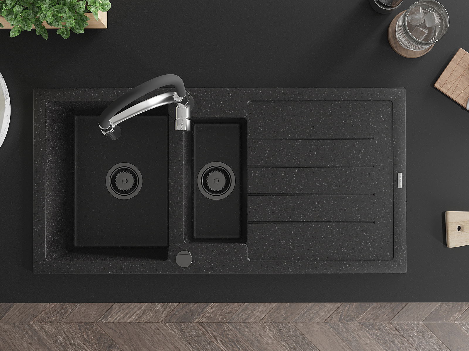Dank des universellen Montagesystems ist die Spüle reversibel und der Abfluss kann links oder rechts auf der Theke montiert werden. Auf diese Weise können Sie die Seite einfach an Ihre Bedürfnisse und Bedingungen einstellen.
