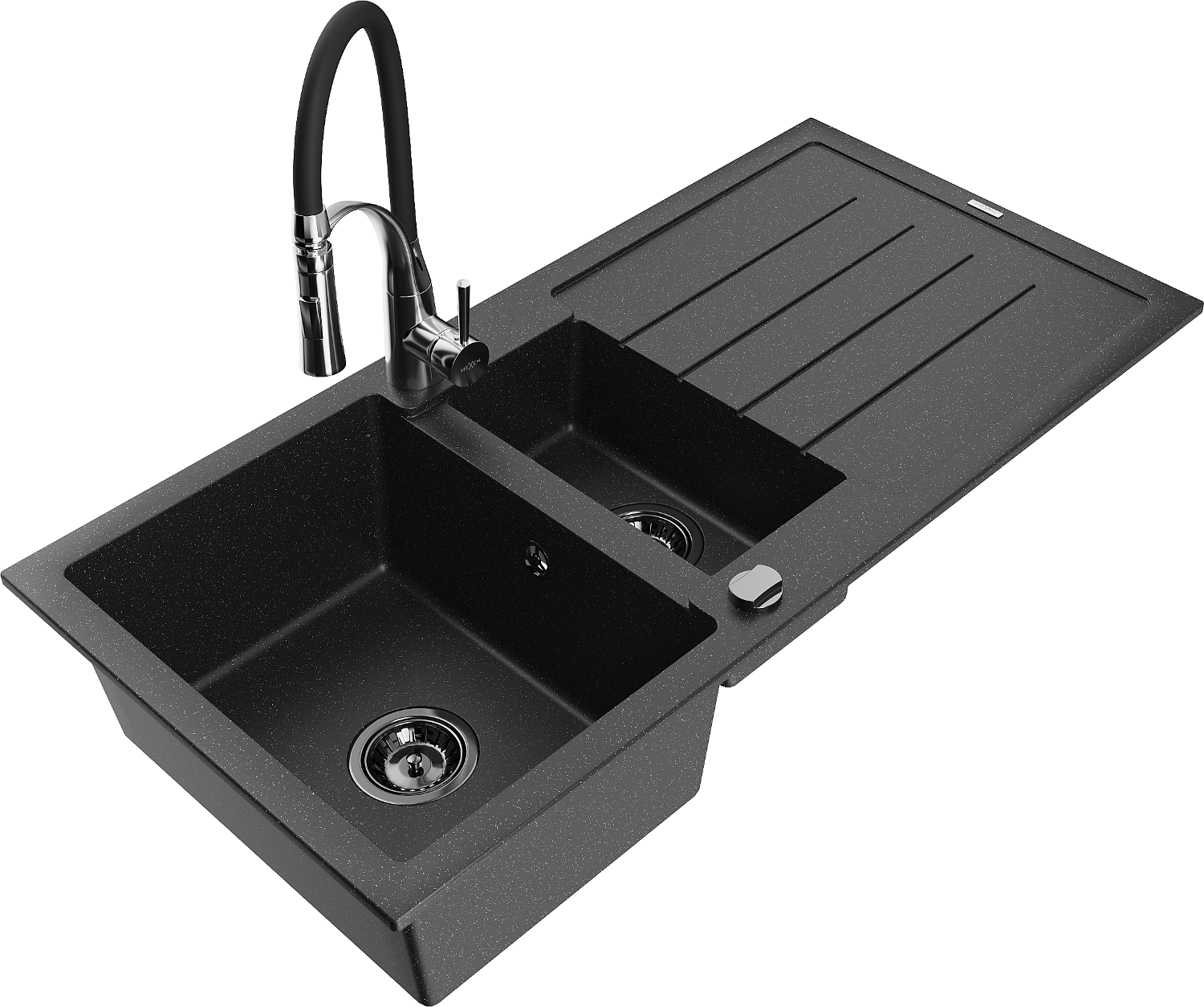Mexen Andres Granitspüle 1,5-Becken mit Abtropffläche und Küchenarmatur Aster, schwarz/silber - 6515-73-73450-07-B