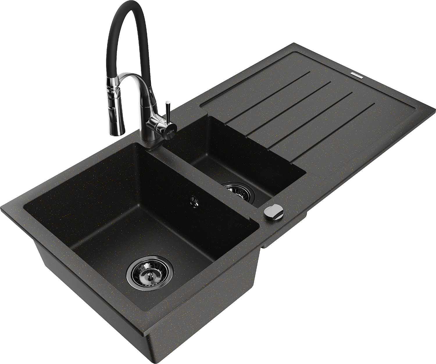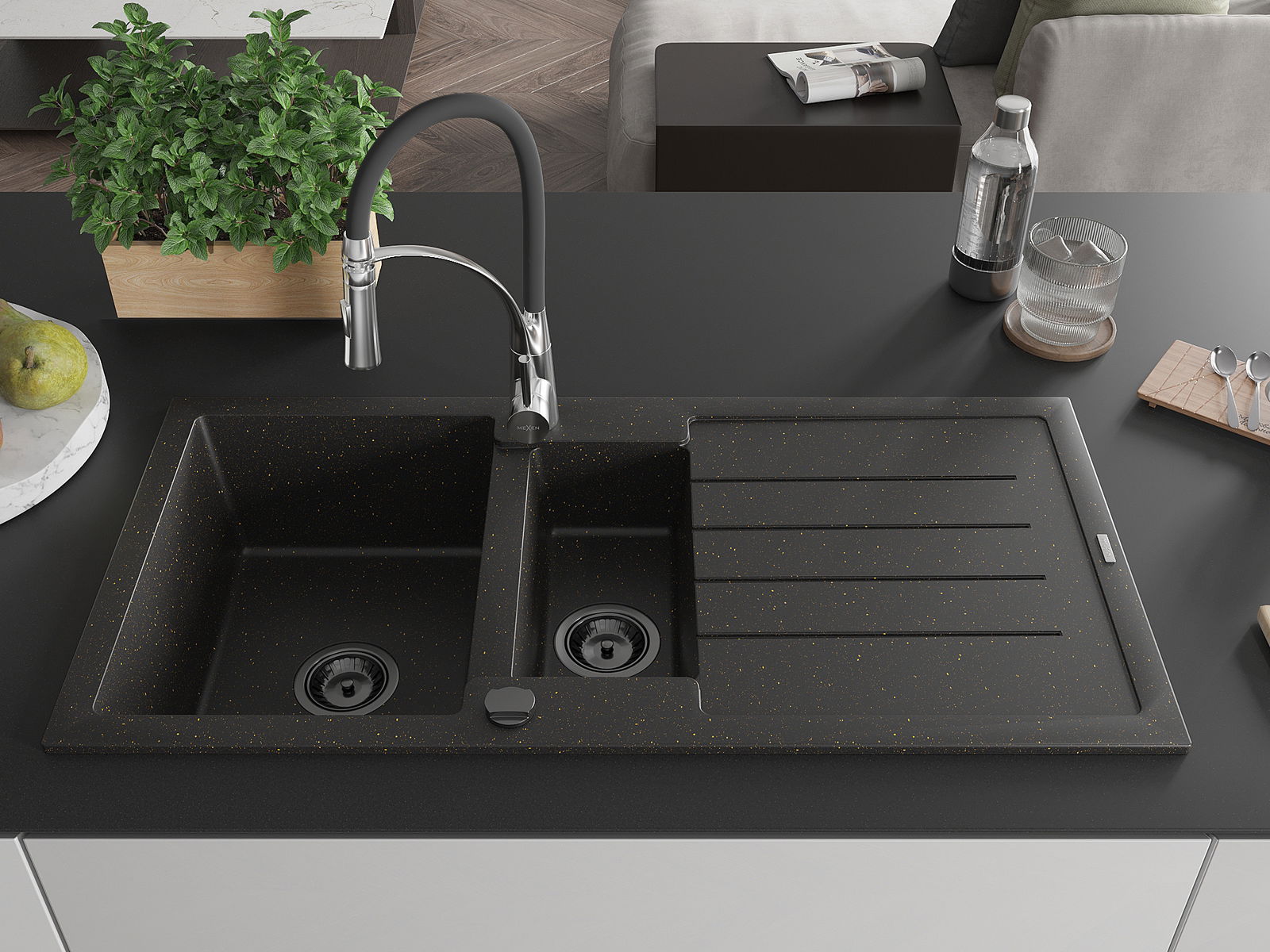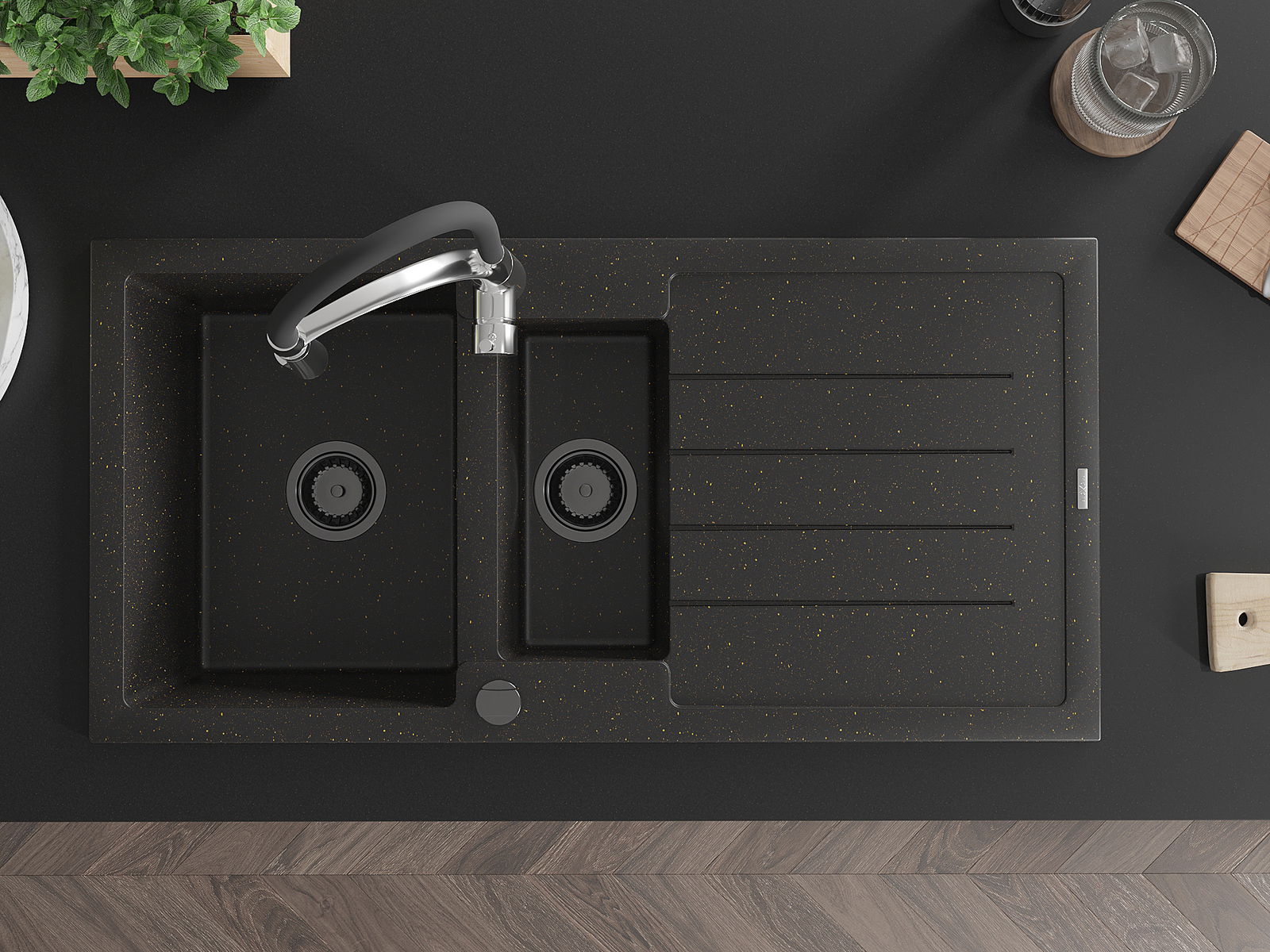 Mexen Andres Granitspüle 1,5-Kammer mit Abtropffläche und Küchenarmatur Aster, schwarz/goldener Metallic - 6515-75-73450-07-B