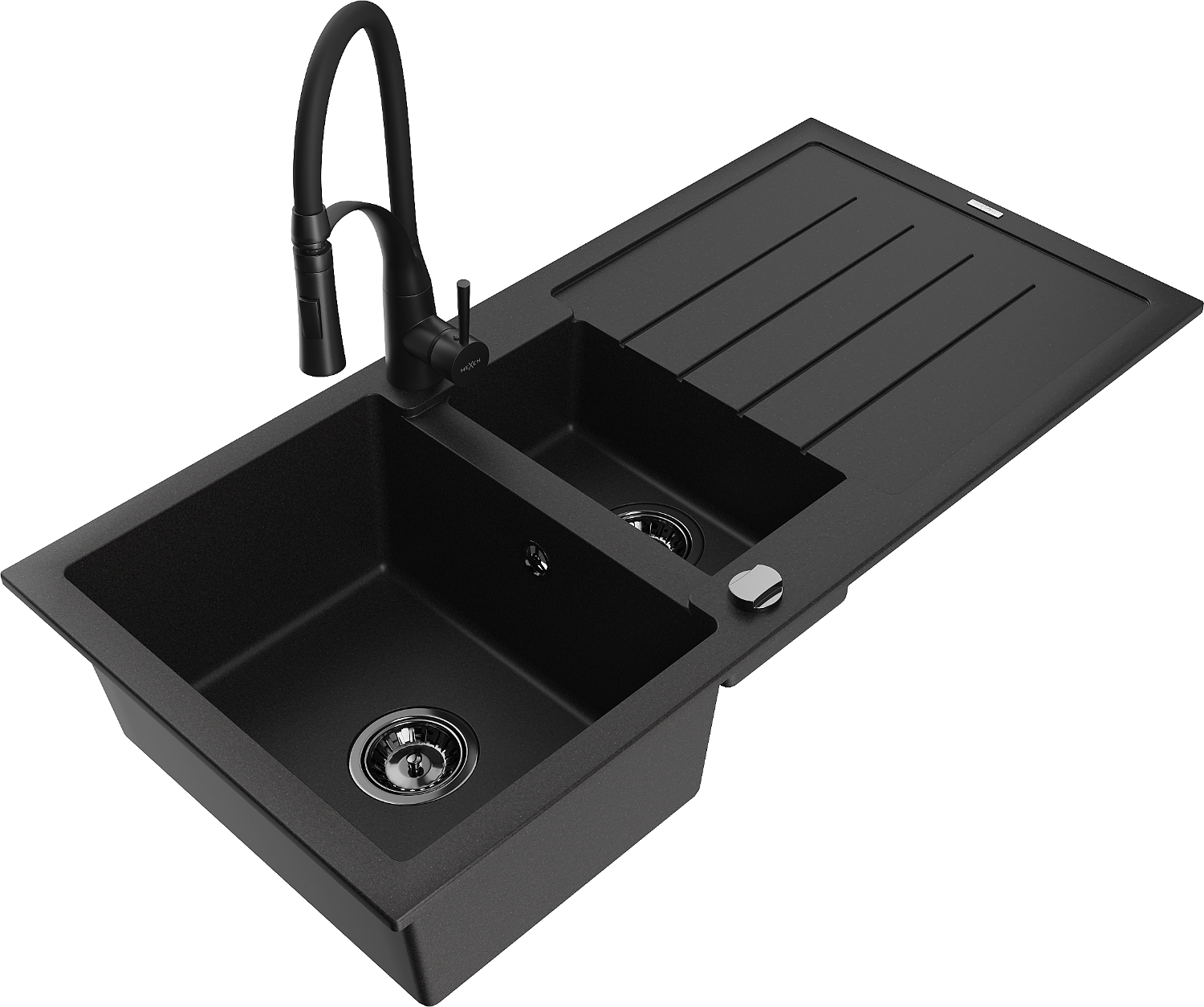 Mexen Andres Granitspüle 1,5-beckig mit Abtropffläche und Küchenarmatur Aster, schwarz - 6515-77-73450-70-B