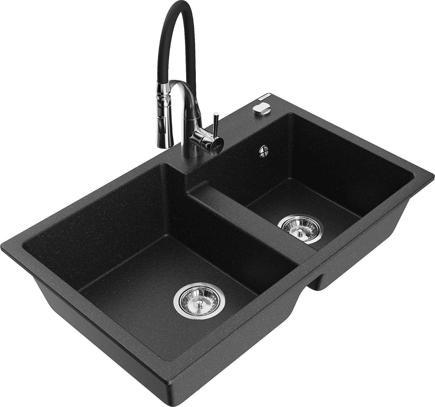 Mexen Tomas Granitspüle 2-Kammern mit Küchenarmatur Aster, schwarz/silber metallic - 6516-73-73450-07