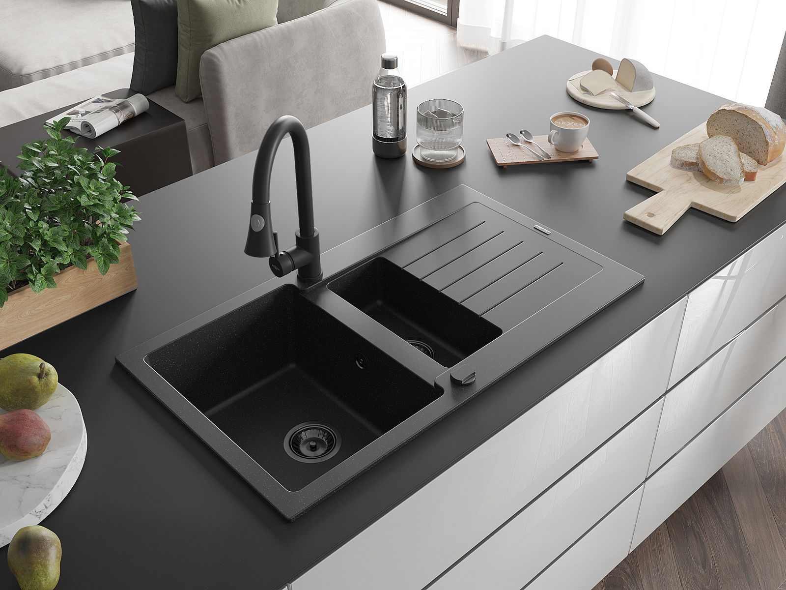 Die Spüle besteht aus hochwertigem Granit. Es ist eine elegante und vor allem praktische Ergänzung zu jeder Küche, unabhängig von ihrem Stil. Hohe Qualität und Granitdauer sorgen für eine langjährige Nutzung.