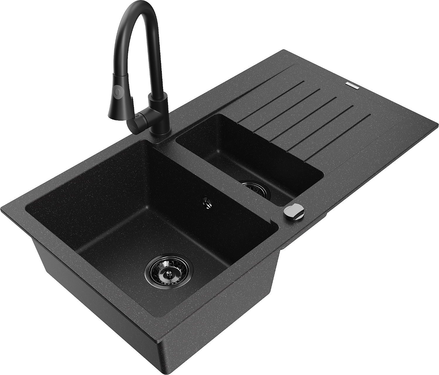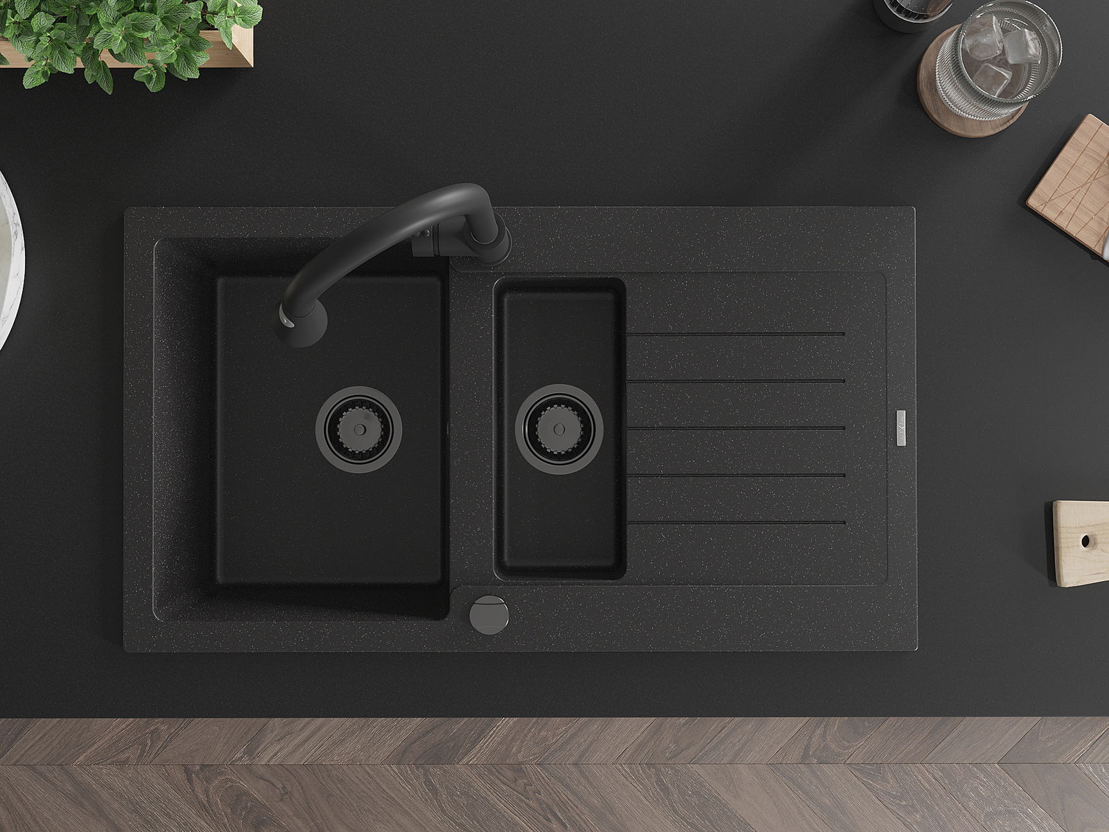 Mexen Matias Granit-Spüle 1,5-beckig mit Abtropffläche und Küchenarmatur Elia, schwarz/silber - 6502-73-670101-70-B