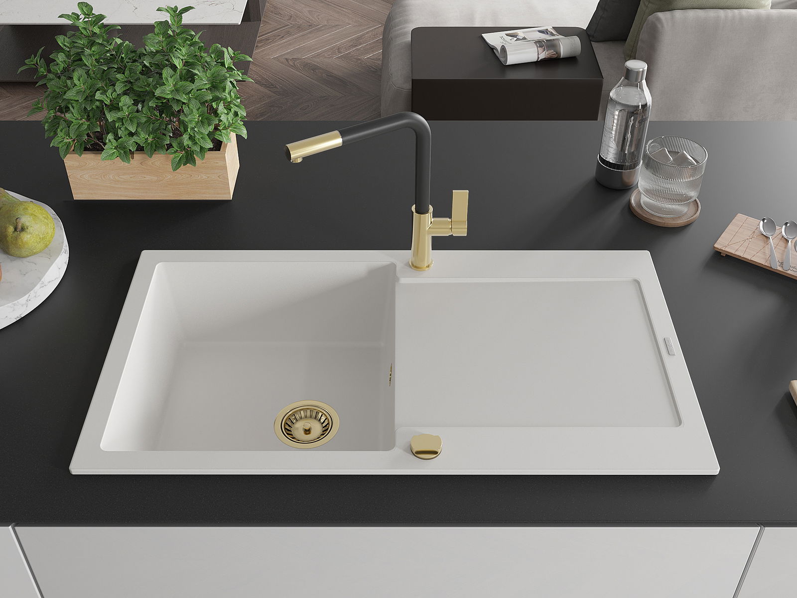 Die Spüle besteht aus hochwertigem Granit. Es ist eine elegante und vor allem praktische Ergänzung zu jeder Küche, unabhängig von ihrem Stil. Hohe Qualität und Granitdauer sorgen für eine langjährige Nutzung.