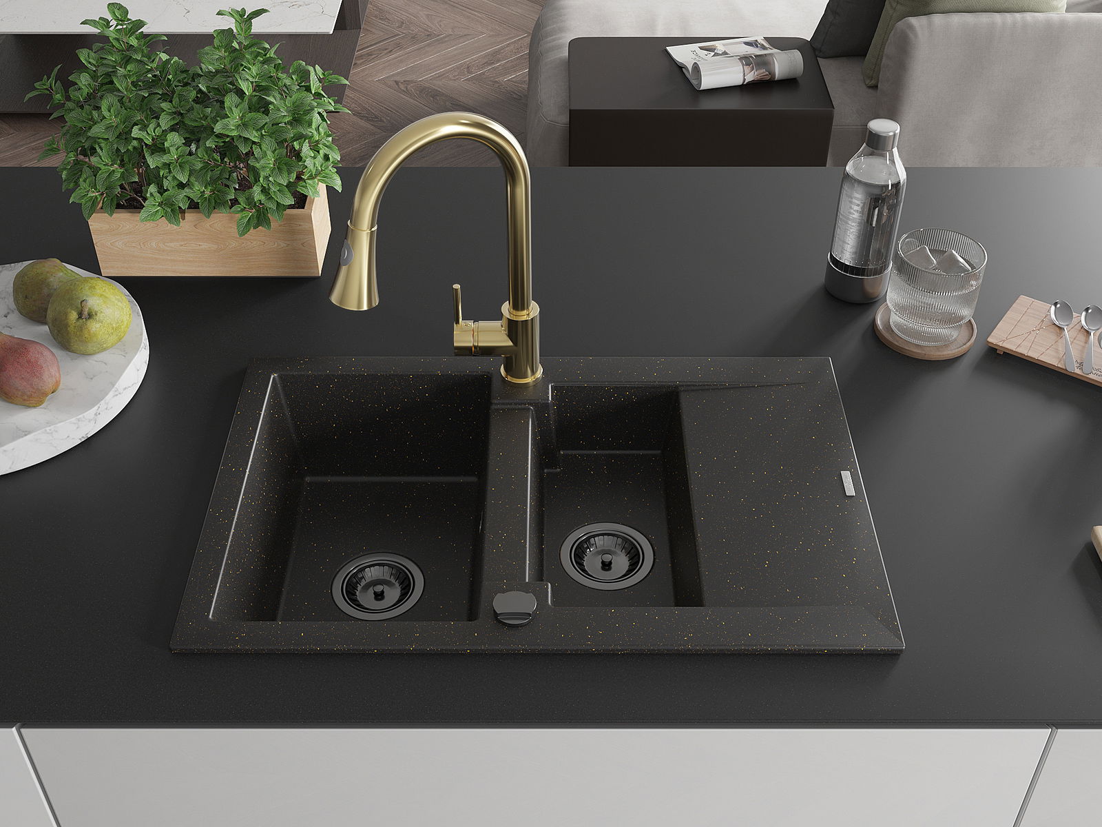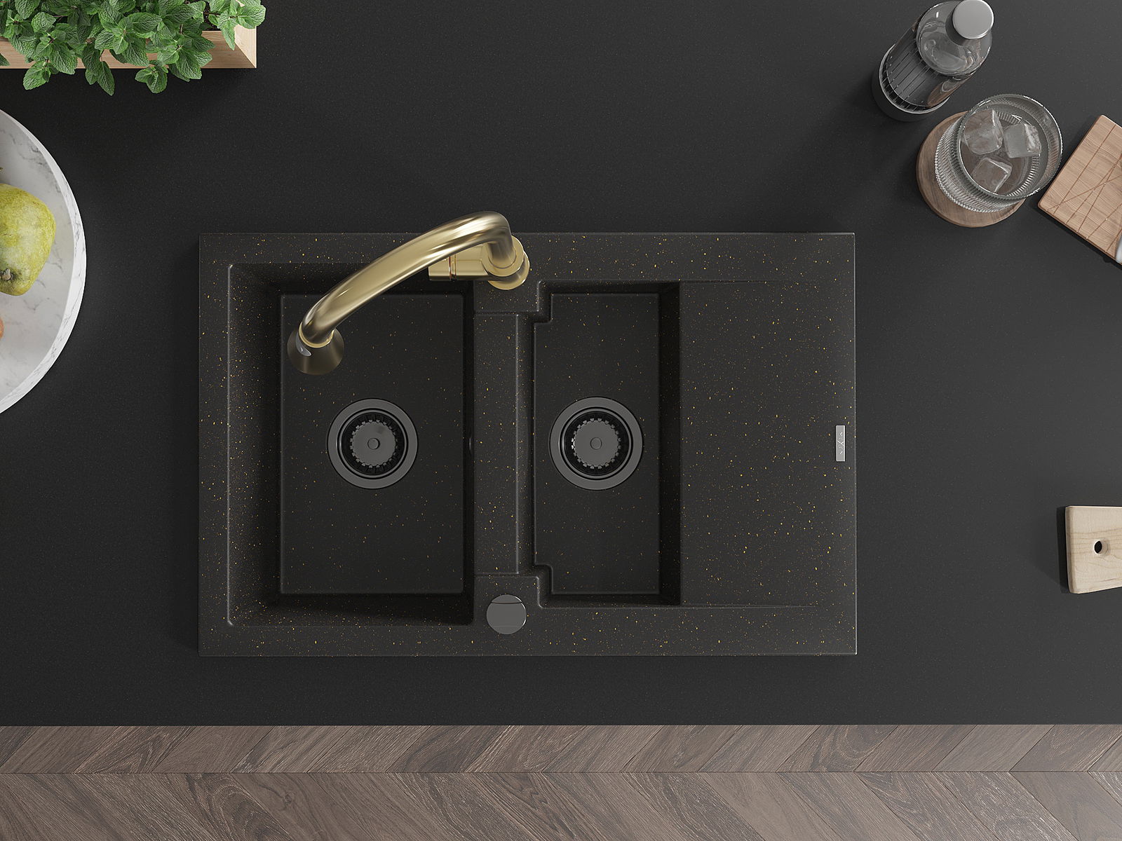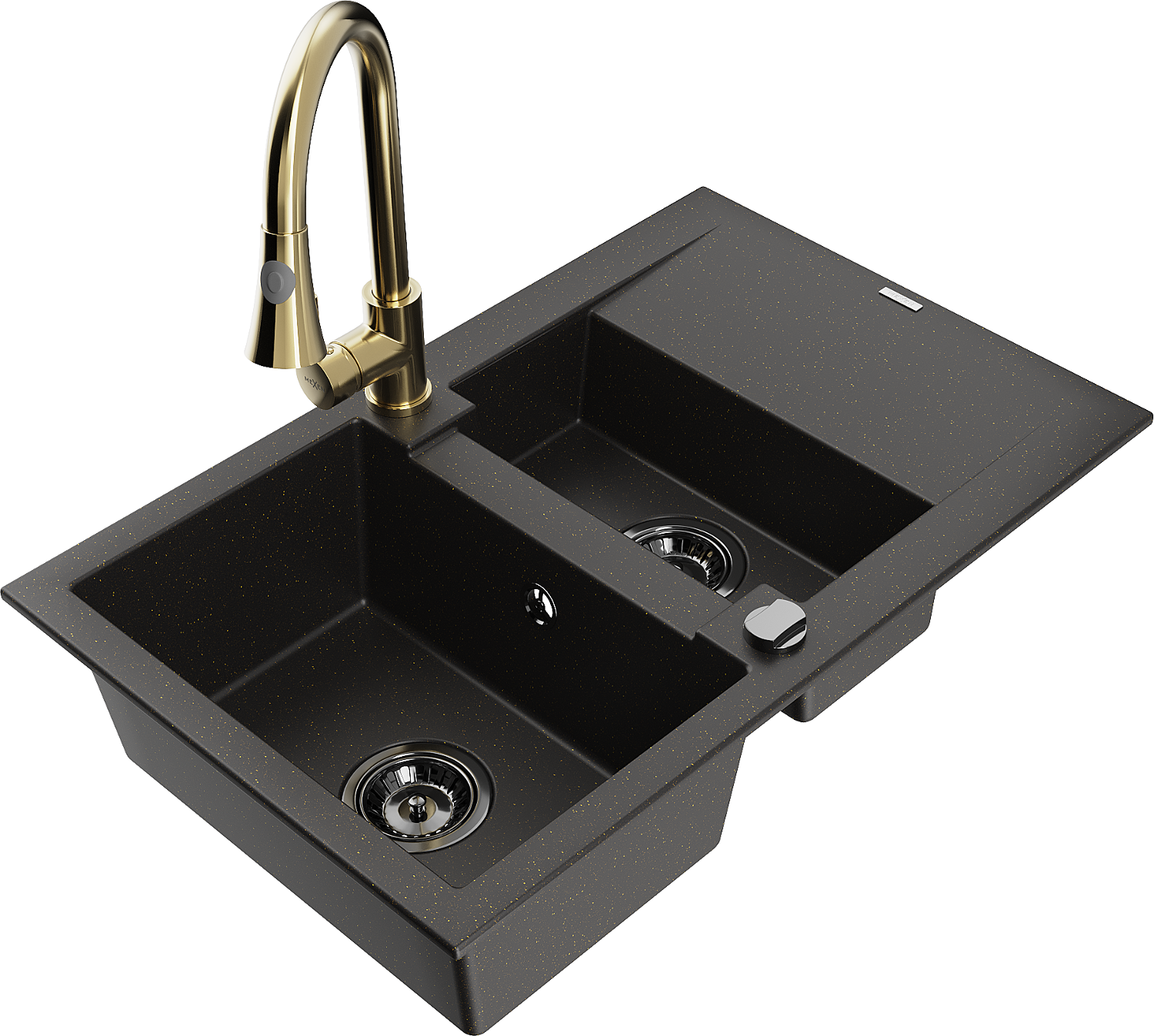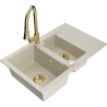 Mexen Gaspar Granitspüle 1,5-Becken mit Abtropffläche und Küchenarmatur Elia, schwarz/gold metallic - 6507-75-670101-50-B