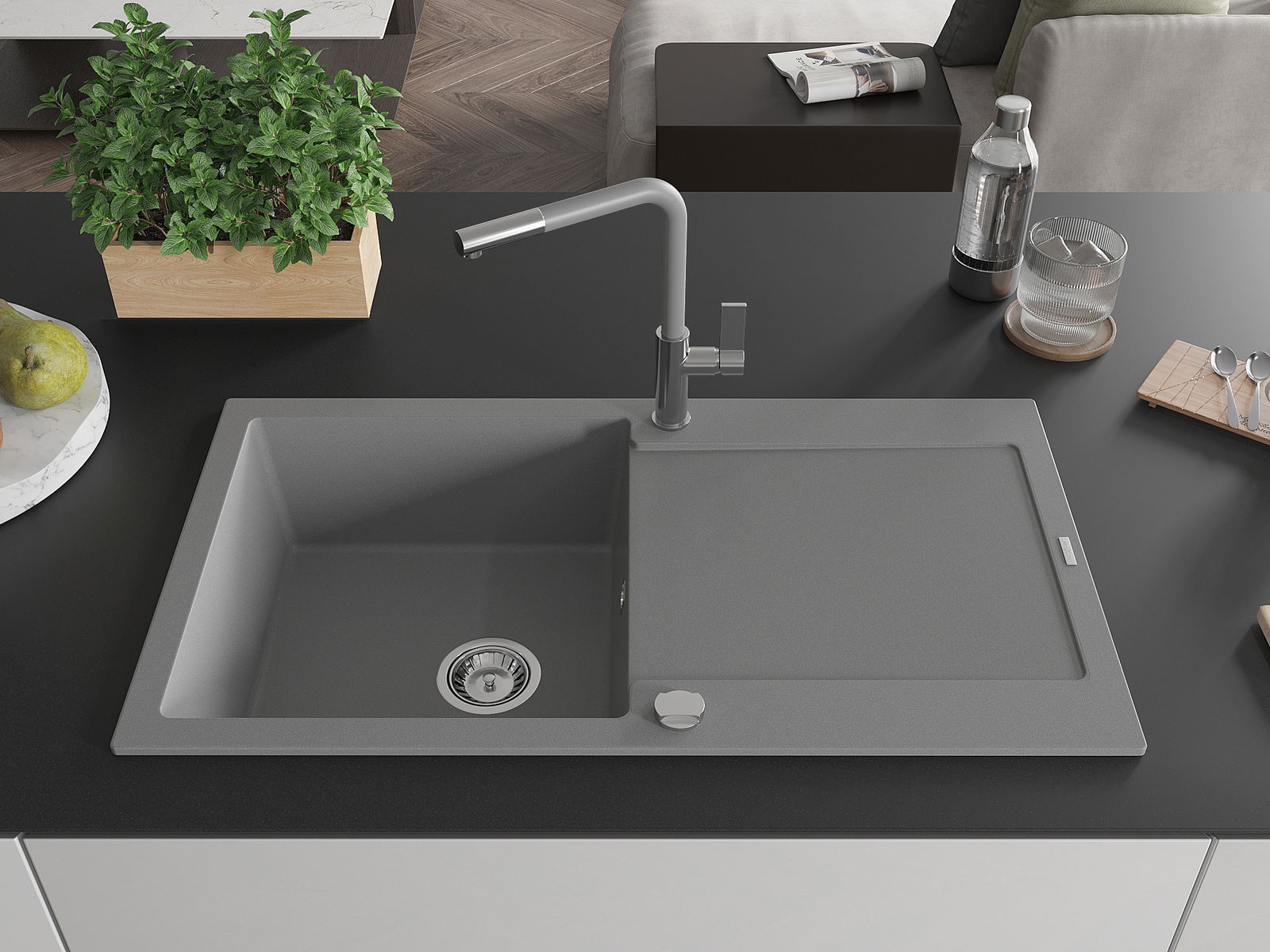 Die Spüle besteht aus hochwertigem Granit. Es ist eine elegante und vor allem praktische Ergänzung zu jeder Küche, unabhängig von ihrem Stil. Hohe Qualität und Granitdauer sorgen für eine langjährige Nutzung.