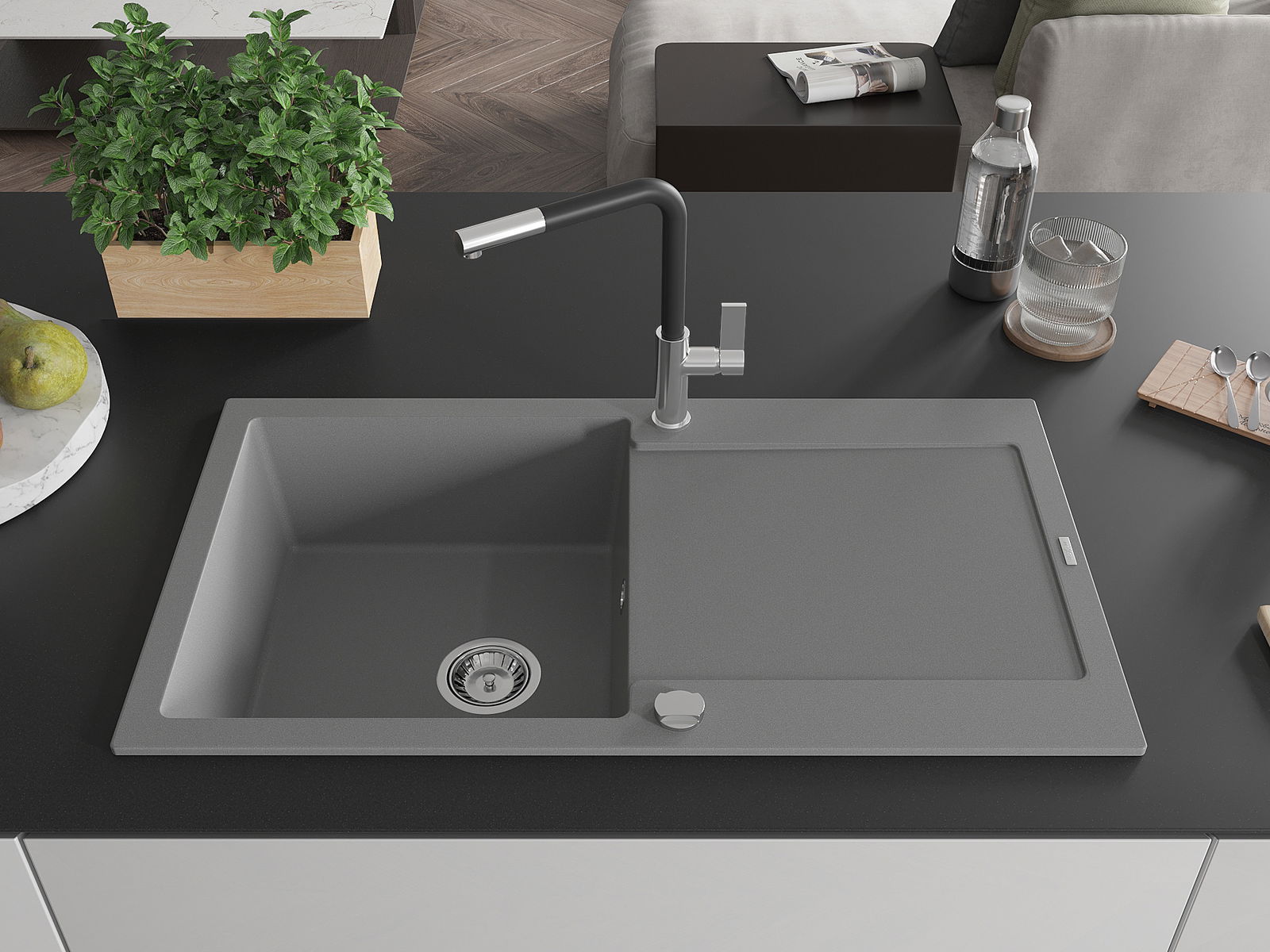 Die Spüle besteht aus hochwertigem Granit. Es ist eine elegante und vor allem praktische Ergänzung zu jeder Küche, unabhängig von ihrem Stil. Hohe Qualität und Granitdauer sorgen für eine langjährige Nutzung.