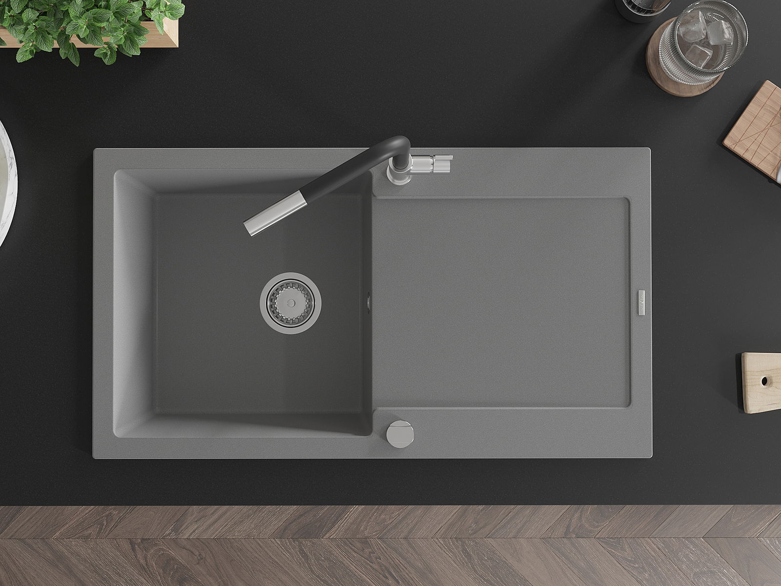 Mexen Leo Granitspüle 1-beckig mit Abtropffläche und Küchenarmatur Flora, grau - 6501-71-670401-07