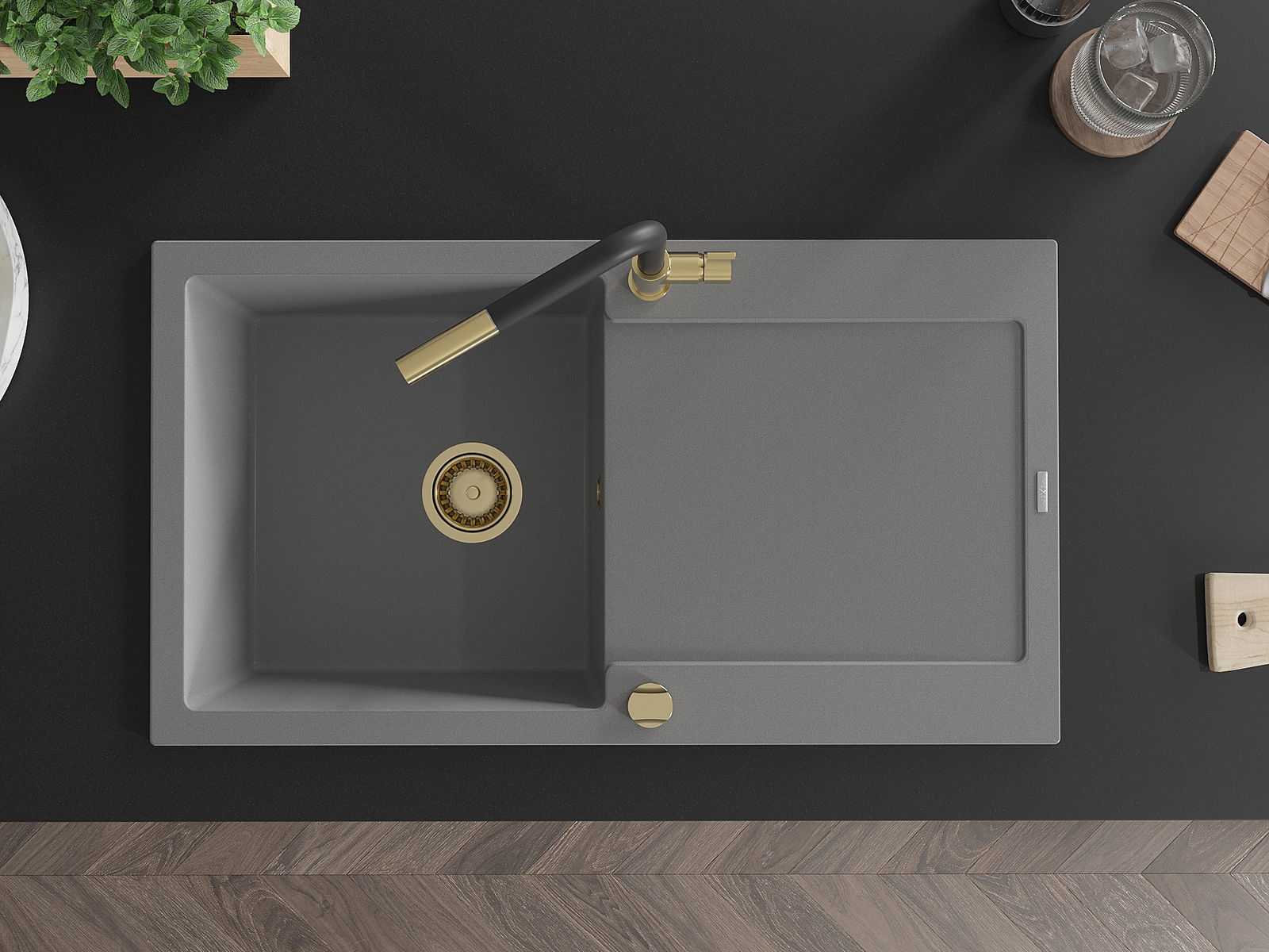Mexen Leo Granitspüle mit 1 Becken, Abtropffläche und Küchenarmatur Flora, grau - 6501-71-670401-57-G