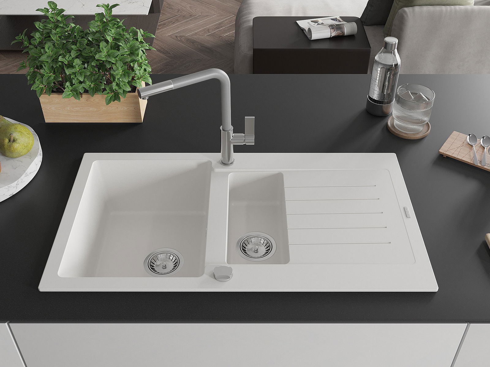Mexen Matias Granitspüle 1,5-Becken mit Abtropffläche und Küchenarmatur Flora, weiß - 6502-20-670401-06