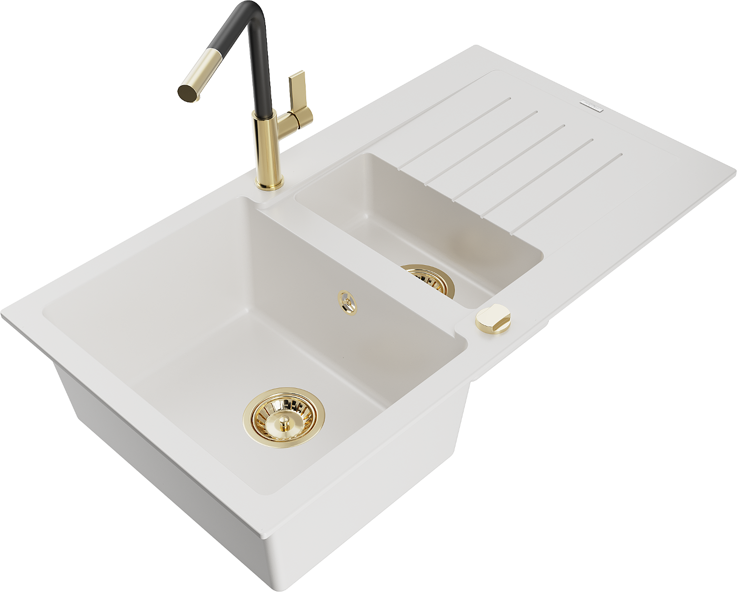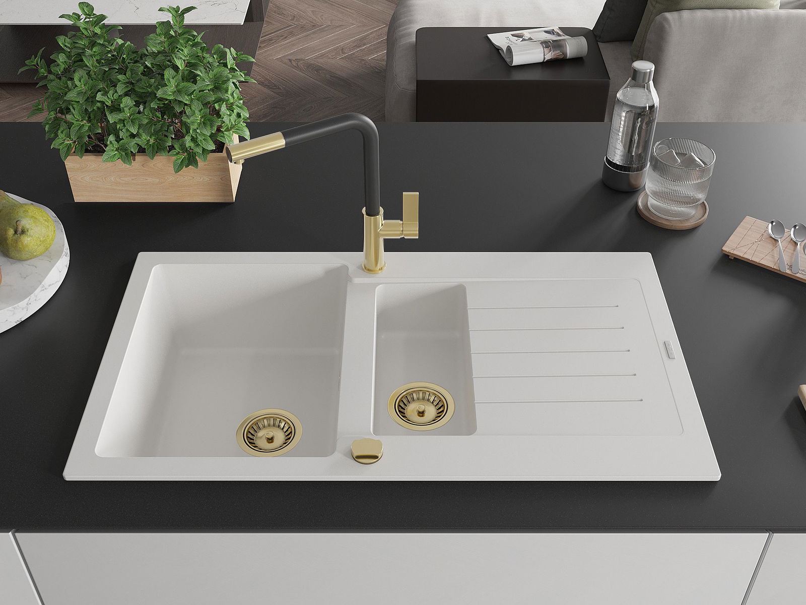 Mexen Matias Granitspüle 1,5-Becken mit Abtropffläche und Küchenarmatur Flora, weiß - 6502-20-670401-57-G