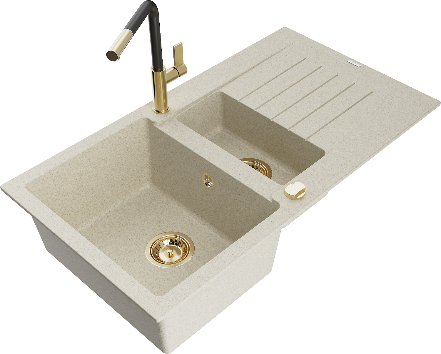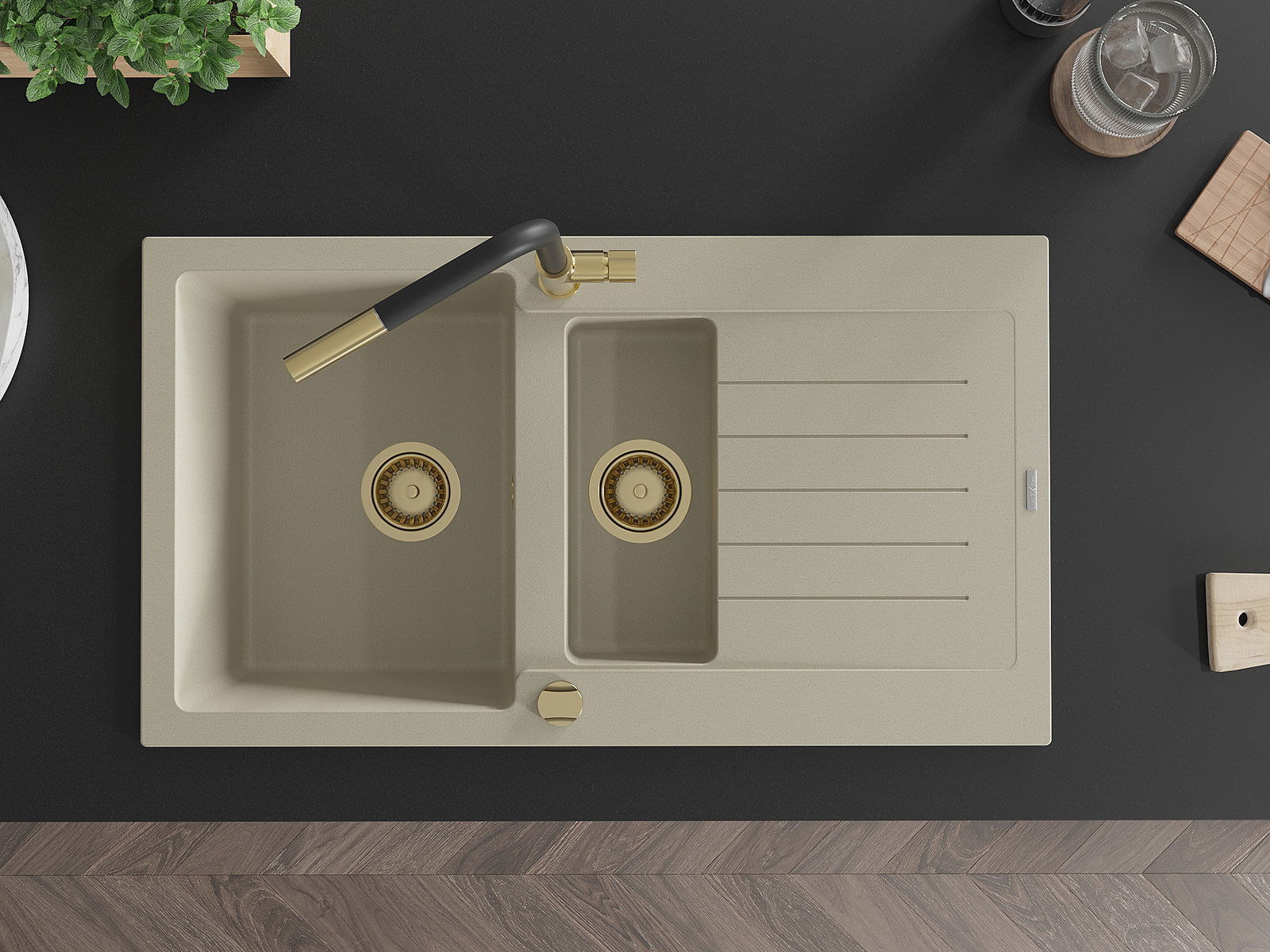 Mexen Matias Granitküchenspüle 1,5-Kammer mit Abtropffläche und Küchenarmatur Flora, beige - 6502-69-670401-57-G