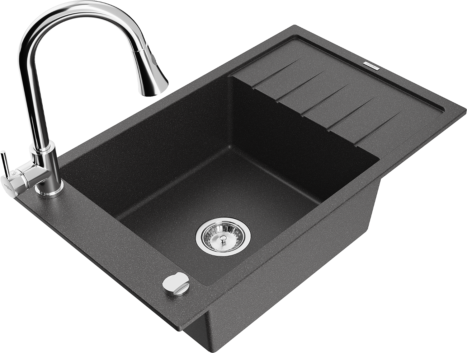 Die Spüle besteht aus hochwertigem Granit. Es ist eine elegante und vor allem praktische Ergänzung zu jeder Küche, unabhängig von ihrem Stil. Hohe Qualität und Granitdauer sorgen für eine langjährige Nutzung.