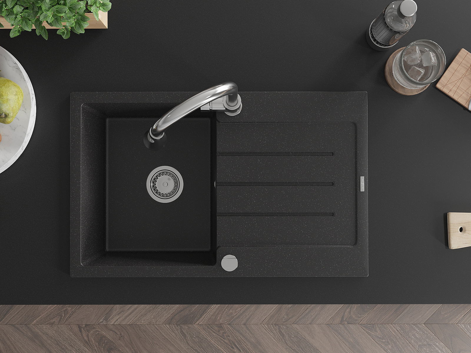 Mexen Bruno Granitspüle 1-beckig mit Abtropffläche und Küchenarmatur Elia, schwarz/silber Metallic - 6513-73-670101-00