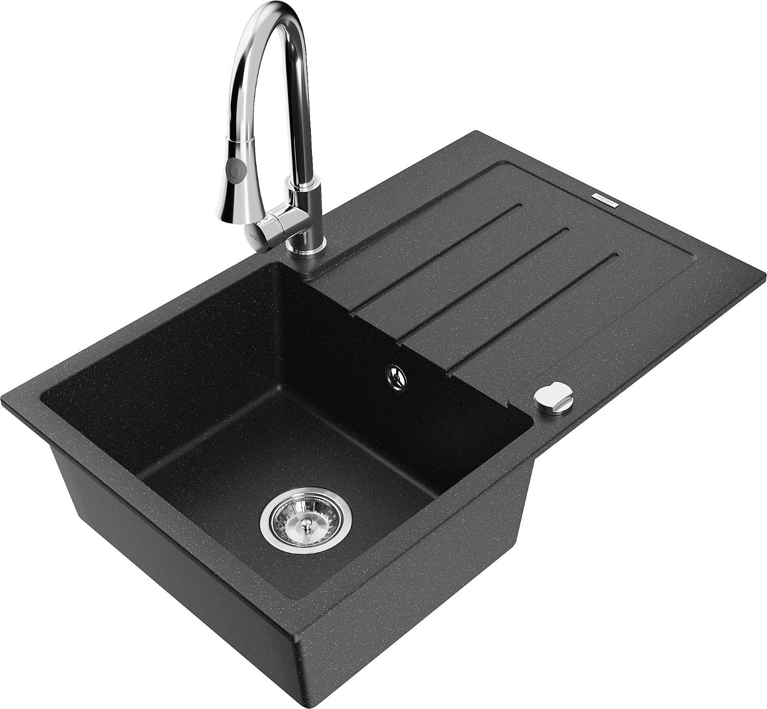 Die Spüle besteht aus hochwertigem Granit. Es ist eine elegante und vor allem praktische Ergänzung zu jeder Küche, unabhängig von ihrem Stil. Hohe Qualität und Granitdauer sorgen für eine langjährige Nutzung.