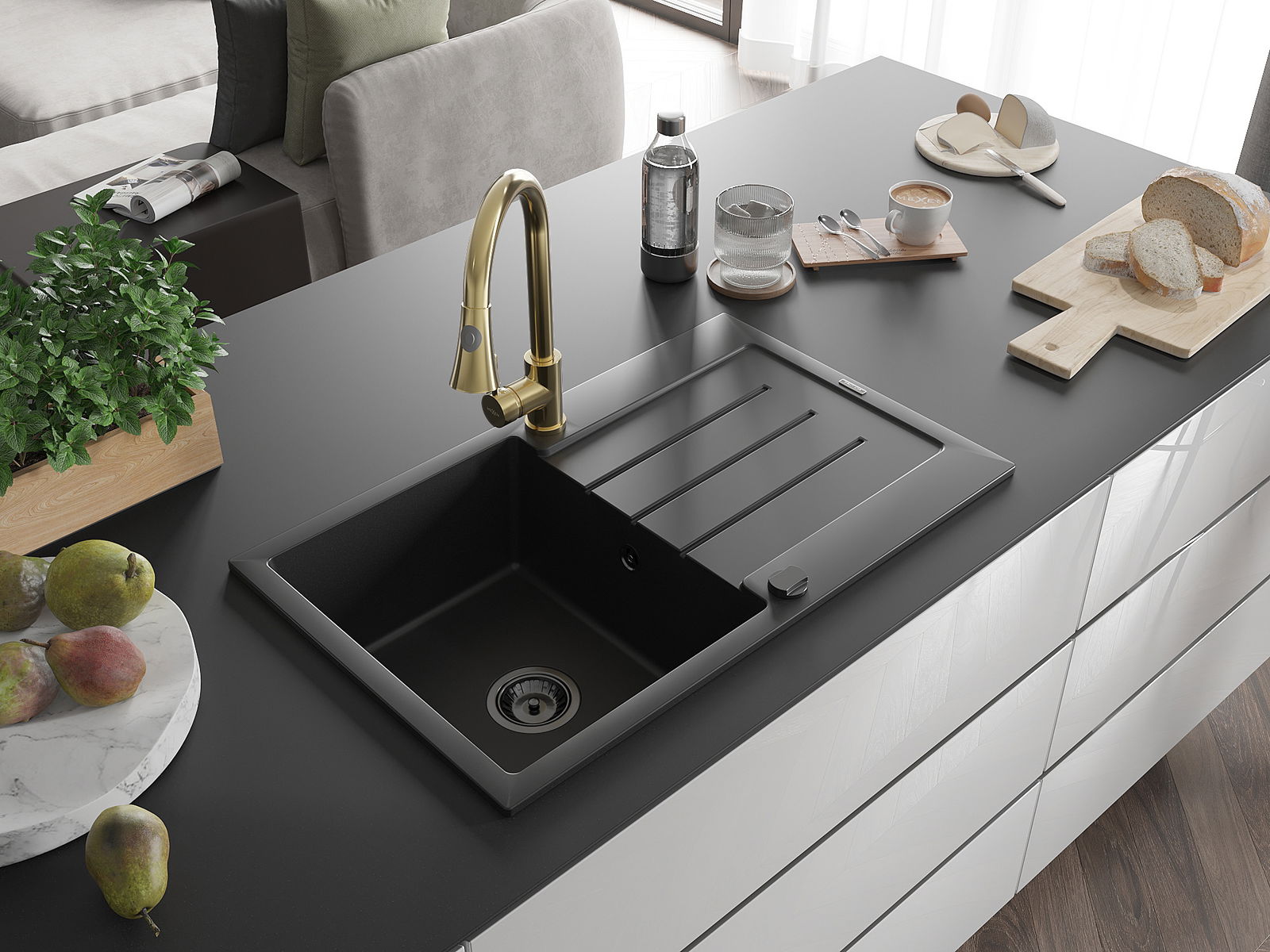 Die Spüle besteht aus hochwertigem Granit. Es ist eine elegante und vor allem praktische Ergänzung zu jeder Küche, unabhängig von ihrem Stil. Hohe Qualität und Granitdauer sorgen für eine langjährige Nutzung.