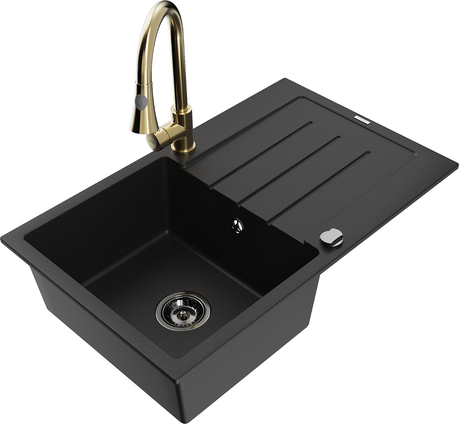 Mexen Bruno Granitspüle 1-Becken mit Abtropffläche und Küchenarmatur Elia, schwarz - 6513-77-670101-50-B