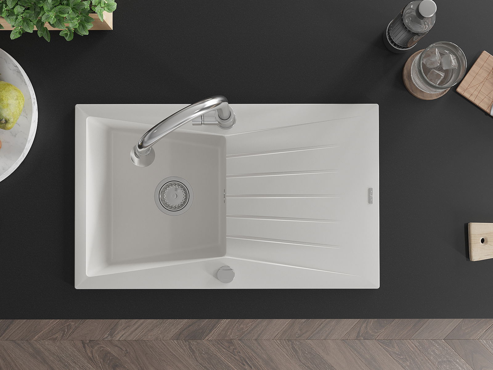 Mexen Cesar Granitspüle 1-Becken mit Abtropffläche und Küchenarmatur Elia, weiß - 6514-20-670101-00