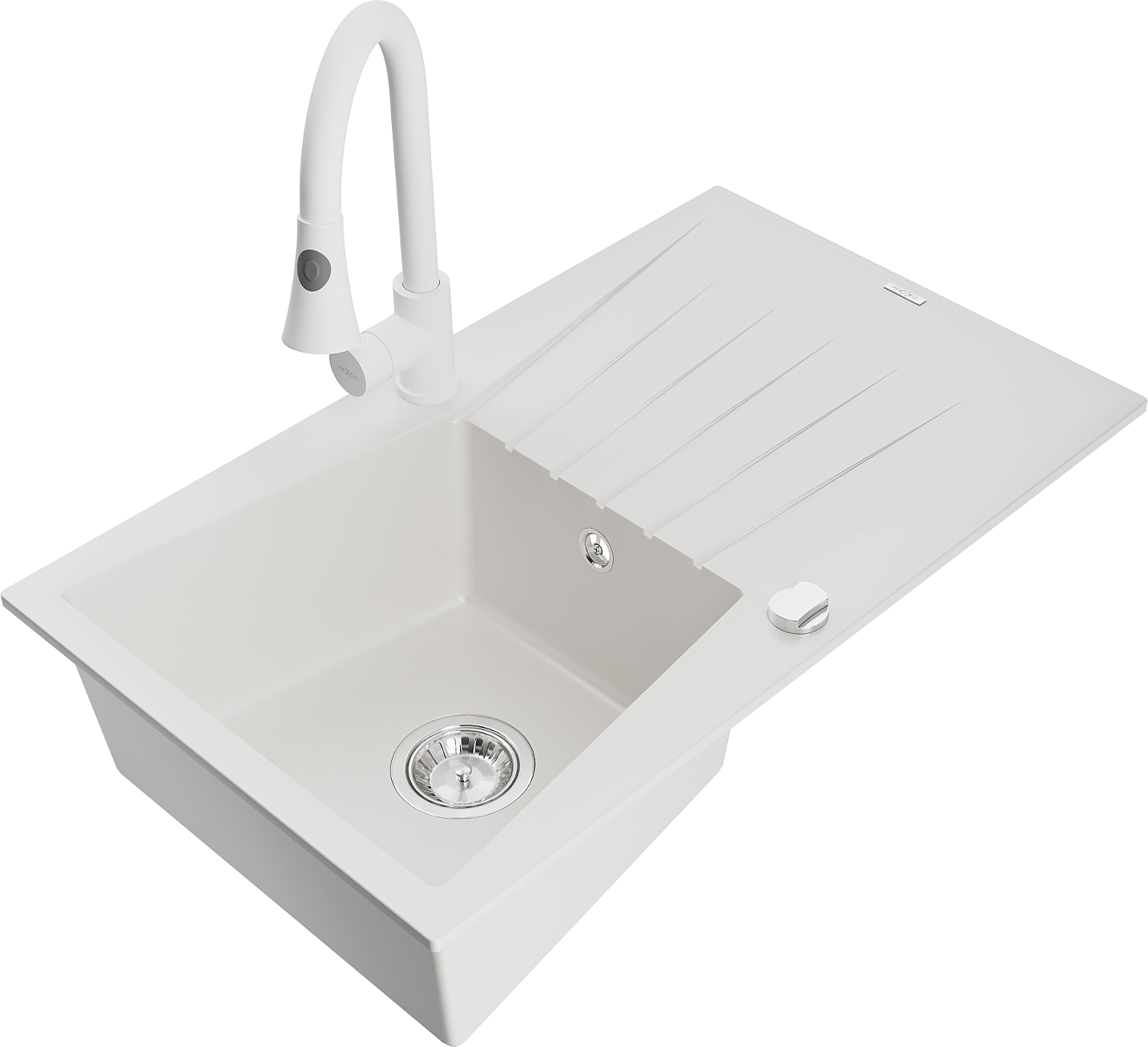 Mexen Cesar Granitspüle 1-Becken mit Abtropffläche und Küchenarmatur Elia, weiß - 6514-20-670101-20