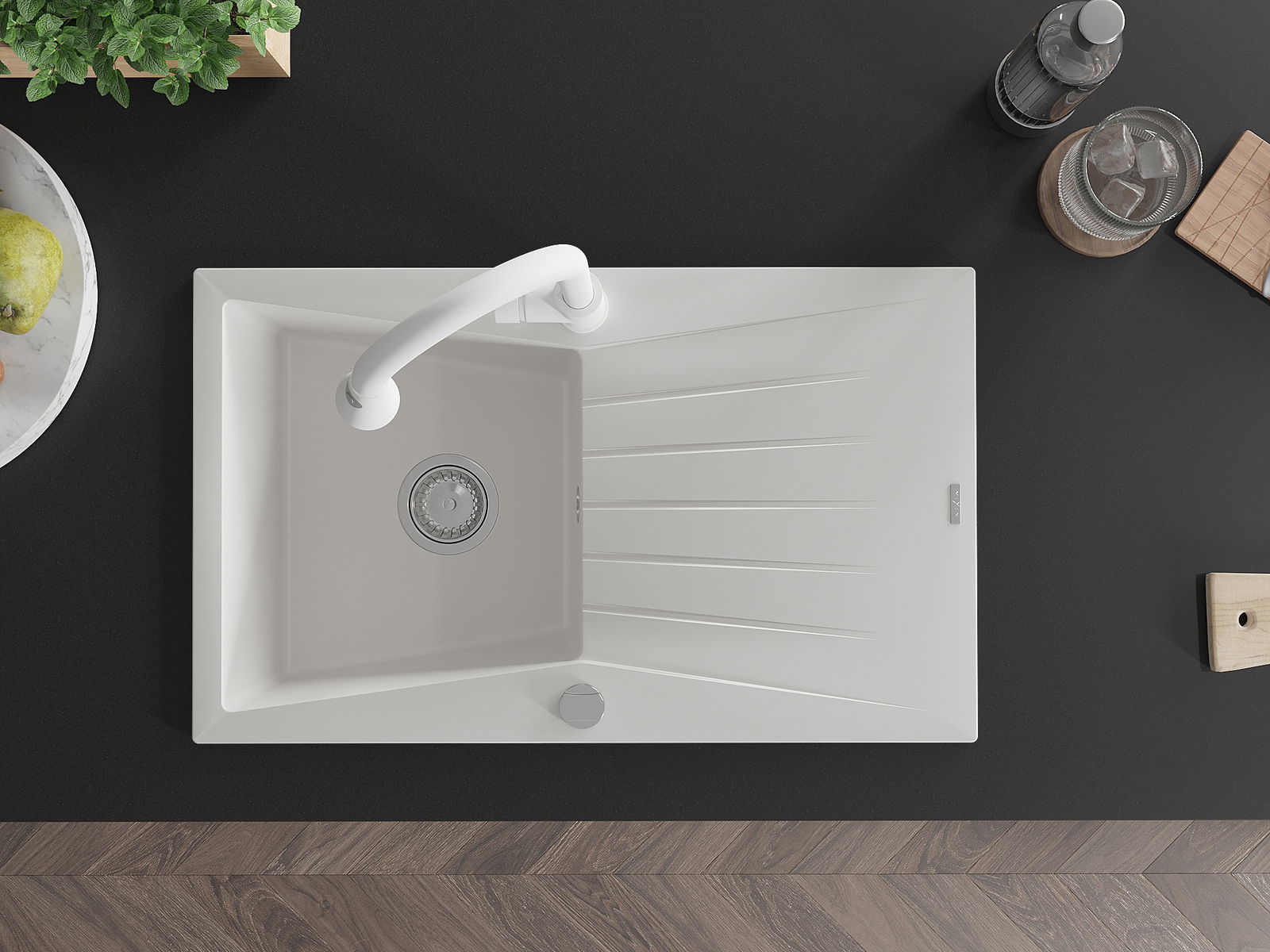 Dank des universellen Montagesystems ist die Spüle reversibel und der Abfluss kann links oder rechts auf der Theke montiert werden. Auf diese Weise können Sie die Seite einfach an Ihre Bedürfnisse und Bedingungen einstellen.