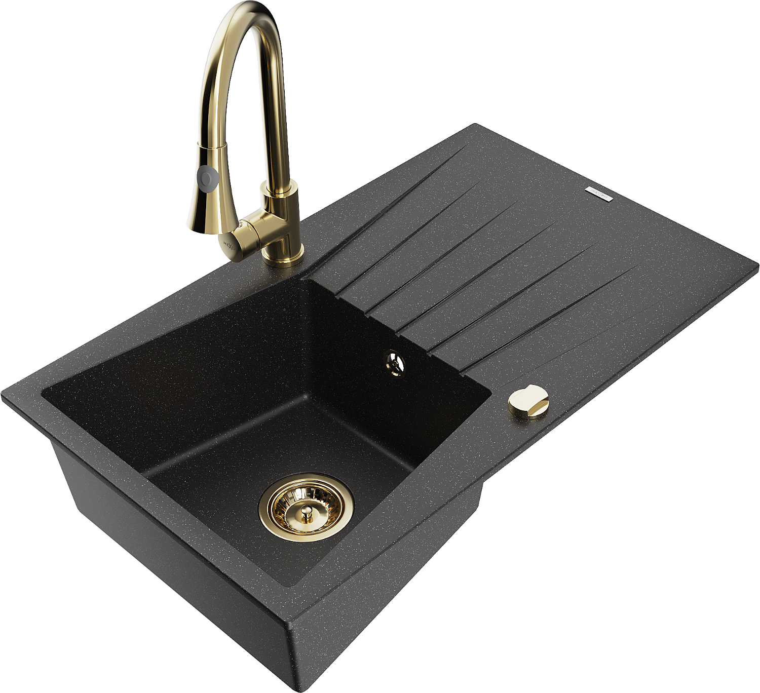 Die Spüle besteht aus hochwertigem Granit. Es ist eine elegante und vor allem praktische Ergänzung zu jeder Küche, unabhängig von ihrem Stil. Hohe Qualität und Granitdauer sorgen für eine langjährige Nutzung.