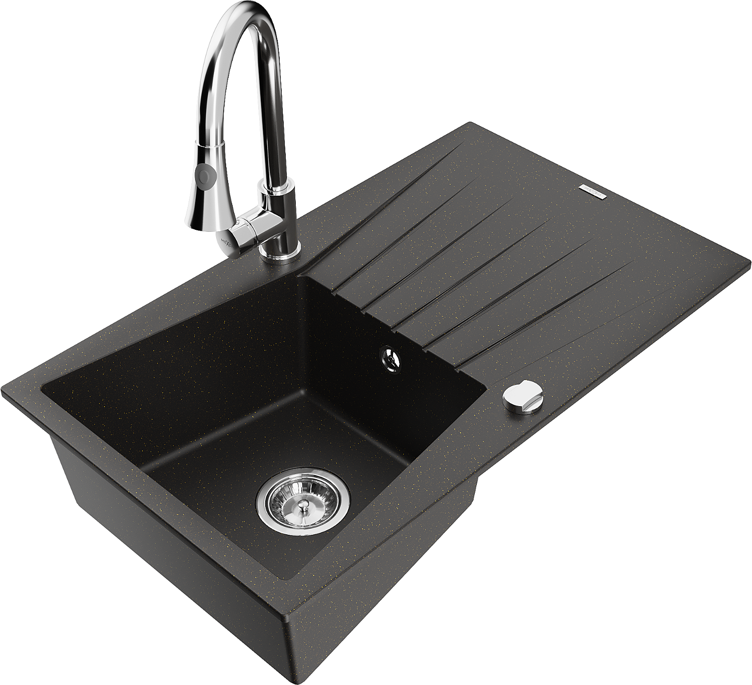 Mexen Cesar Granitspüle 1-Becken mit Abtropffläche und Küchenarmatur Elia, schwarz/goldmetallik - 6514-75-670101-00