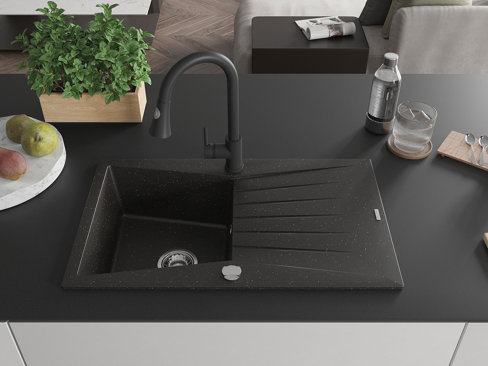 Die Spüle besteht aus hochwertigem Granit. Es ist eine elegante und vor allem praktische Ergänzung zu jeder Küche, unabhängig von ihrem Stil. Hohe Qualität und Granitdauer sorgen für eine langjährige Nutzung.
