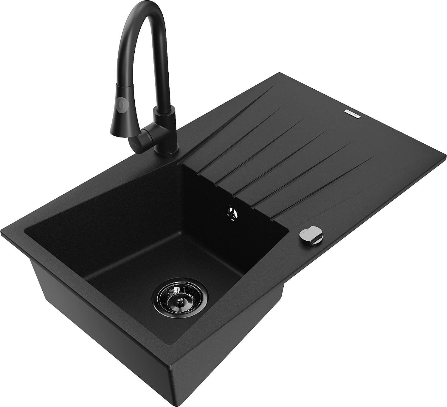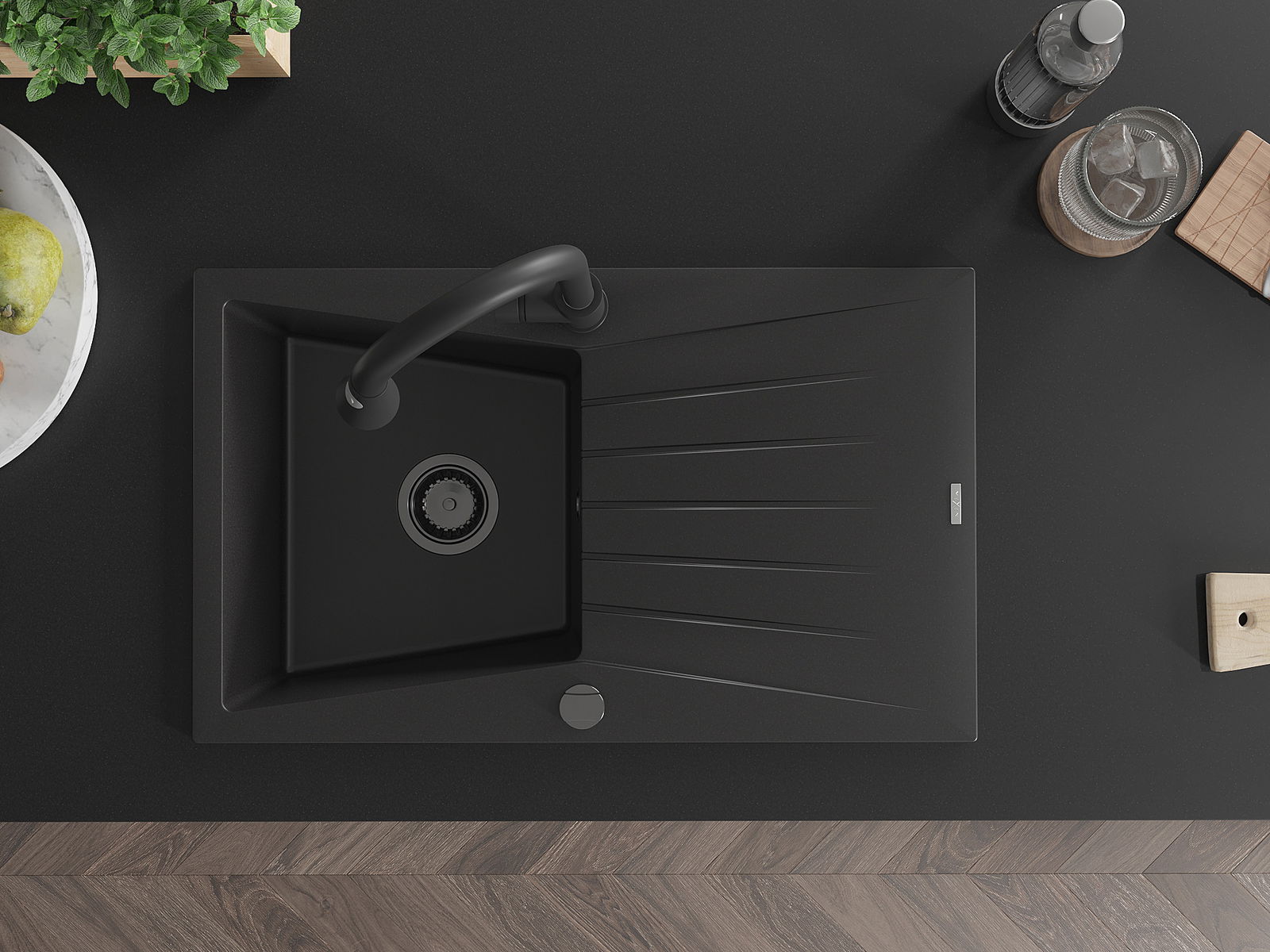 Mexen Cesar Granitspüle mit einer Kammer, Abtropffläche und Küchenarmatur Elia, schwarz - 6514-77-670101-70-B