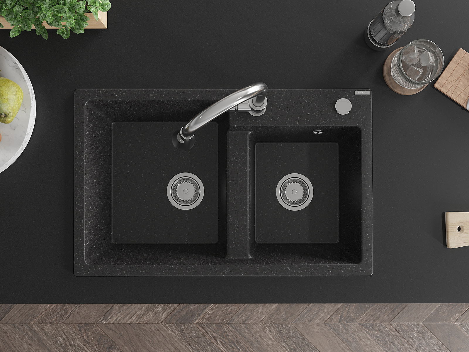 Mexen Tomas Granitspüle 2-Becken mit Küchenarmatur Elia, schwarz/silber metallic - 6516-73-670101-00