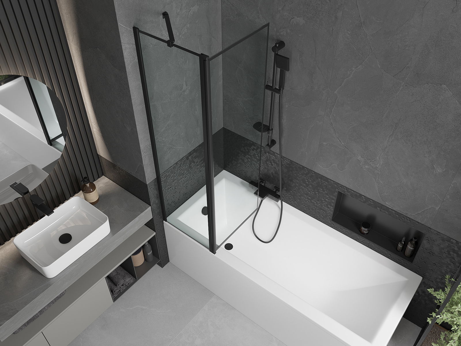 Der Bildschirm hat einen beweglichen Flügel mit der Möglichkeit des Faltens. Diese Lösung spart mehr Platz im Badezimmer und ermöglicht es Ihnen, den verbleibenden Platz frei zu nutzen, wenn wir den Badebereich nicht nutzen.