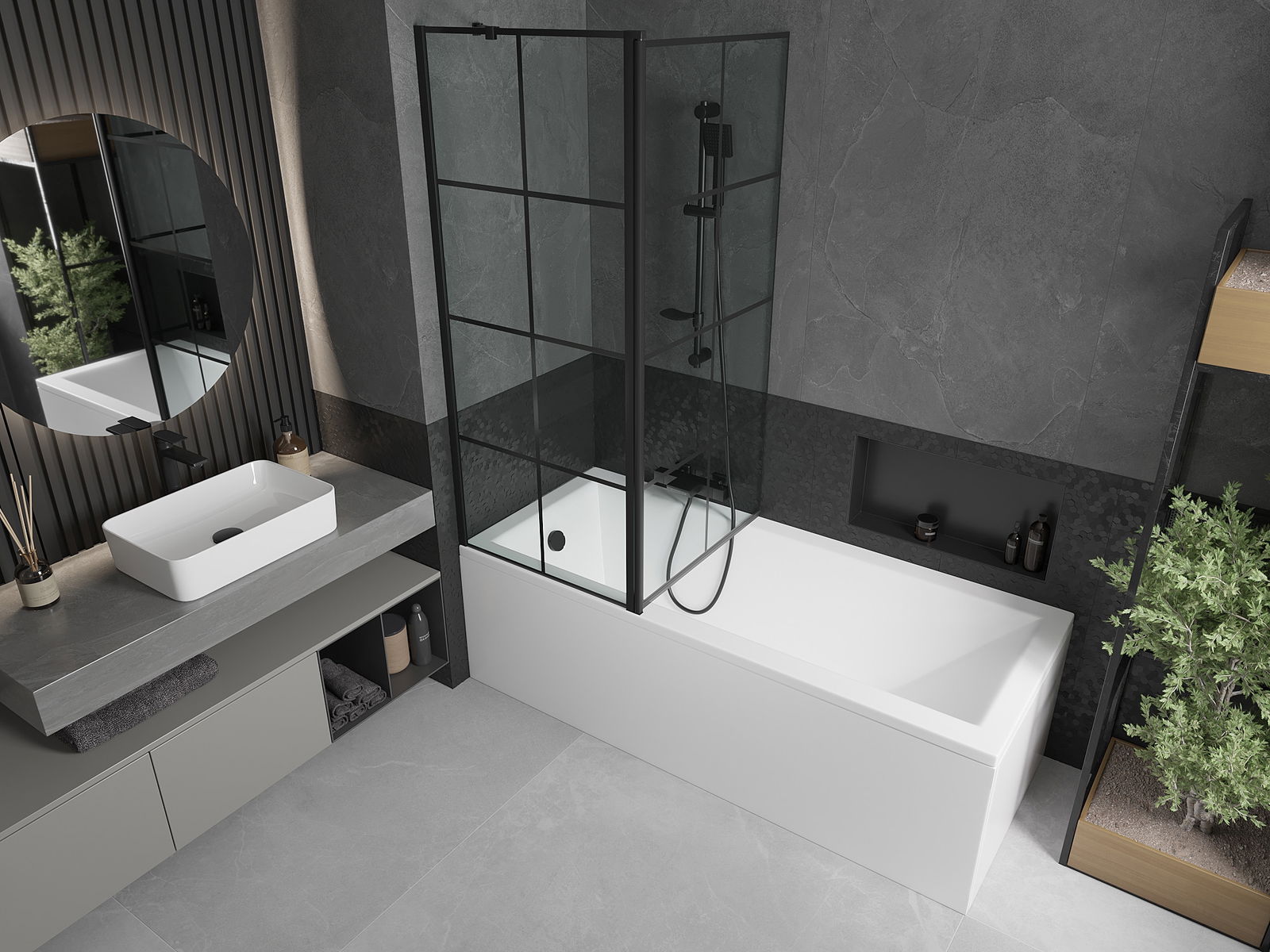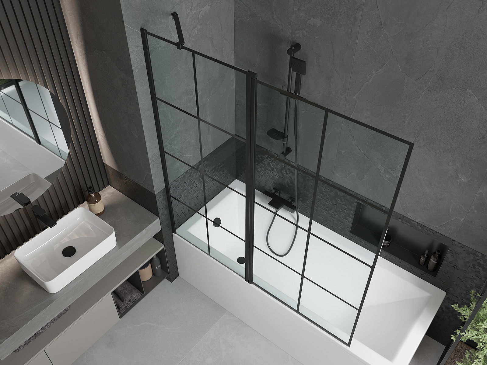 Der Bildschirm hat einen beweglichen Flügel mit der Möglichkeit des Faltens. Diese Lösung spart mehr Platz im Badezimmer und ermöglicht es Ihnen, den verbleibenden Platz frei zu nutzen, wenn wir den Badebereich nicht nutzen.
