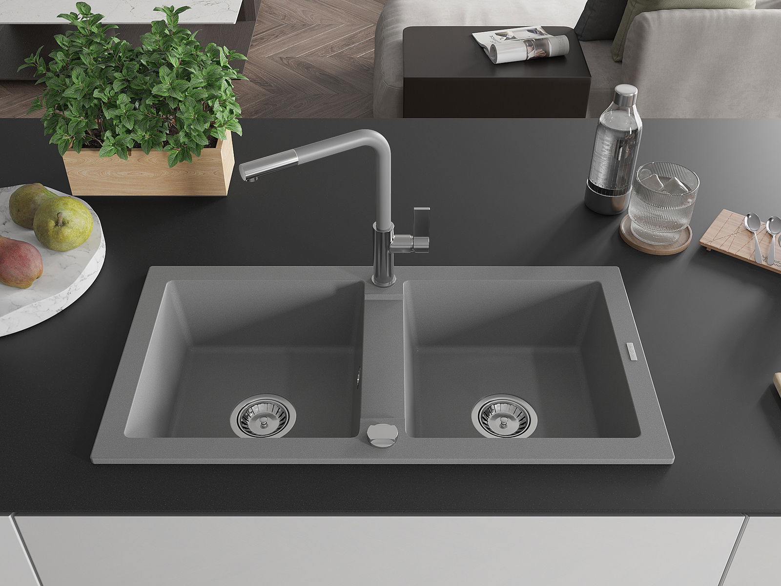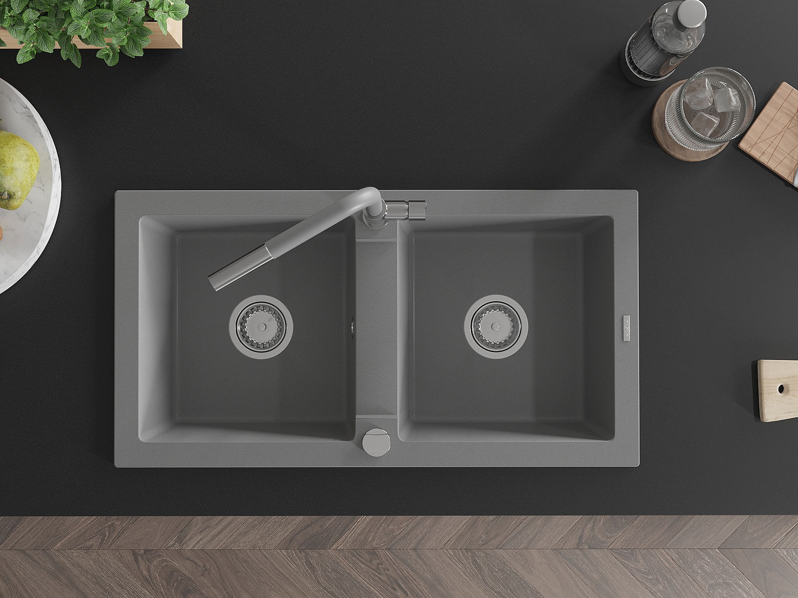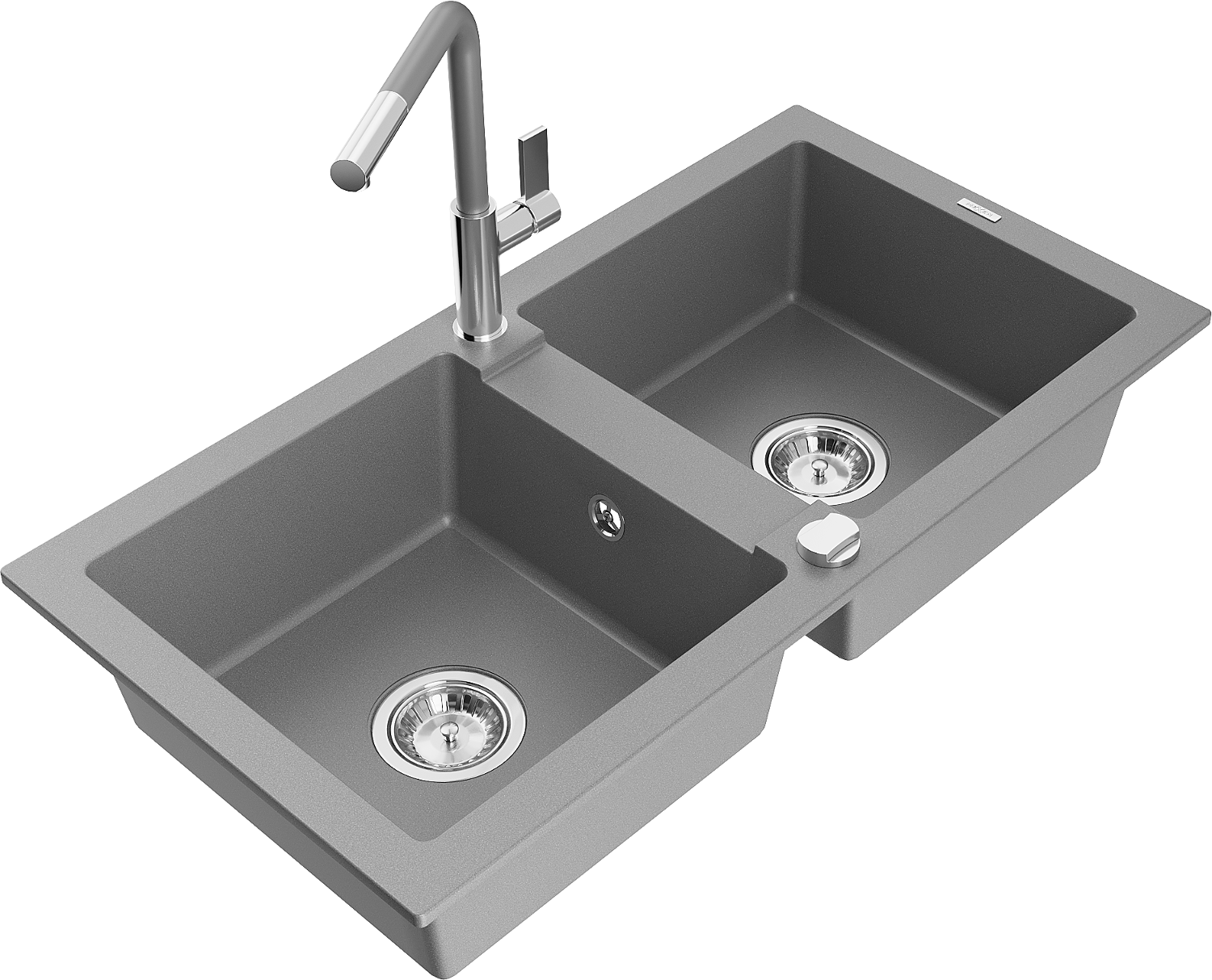 Mexen Mario Granitspüle 2-Kammer mit Küchenarmatur Flora, grau - 6504-71-670401-06
