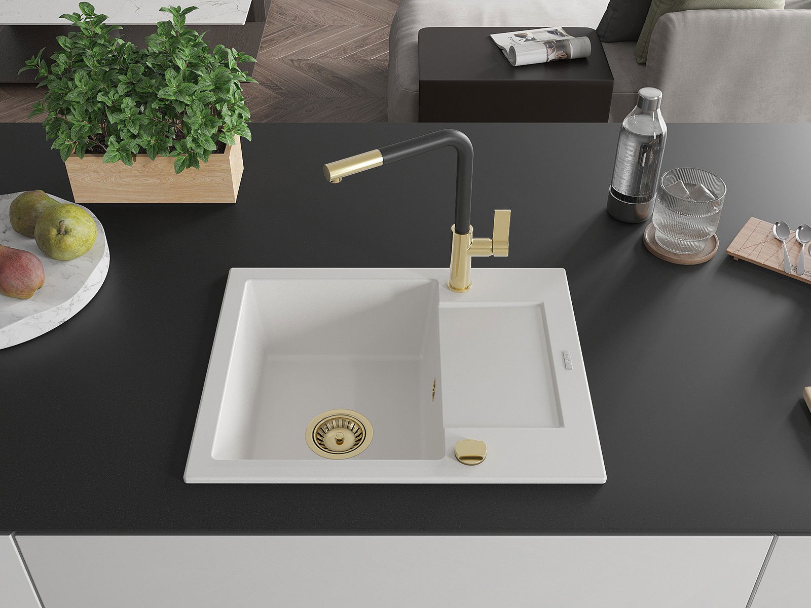 Die Spüle besteht aus hochwertigem Granit. Es ist eine elegante und vor allem praktische Ergänzung zu jeder Küche, unabhängig von ihrem Stil. Hohe Qualität und Granitdauer sorgen für eine langjährige Nutzung.