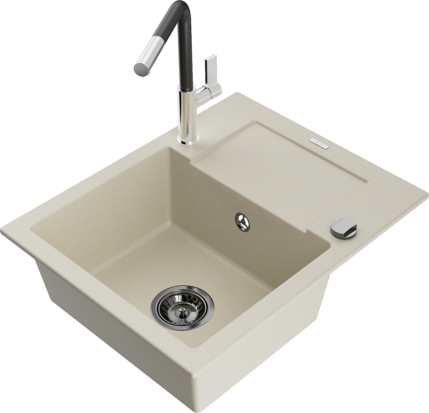 Mexen Enzo Granitspüle, ein Becken mit Abtropffläche und Küchenarmatur Flora, beige - 6506-69-670401-07-B